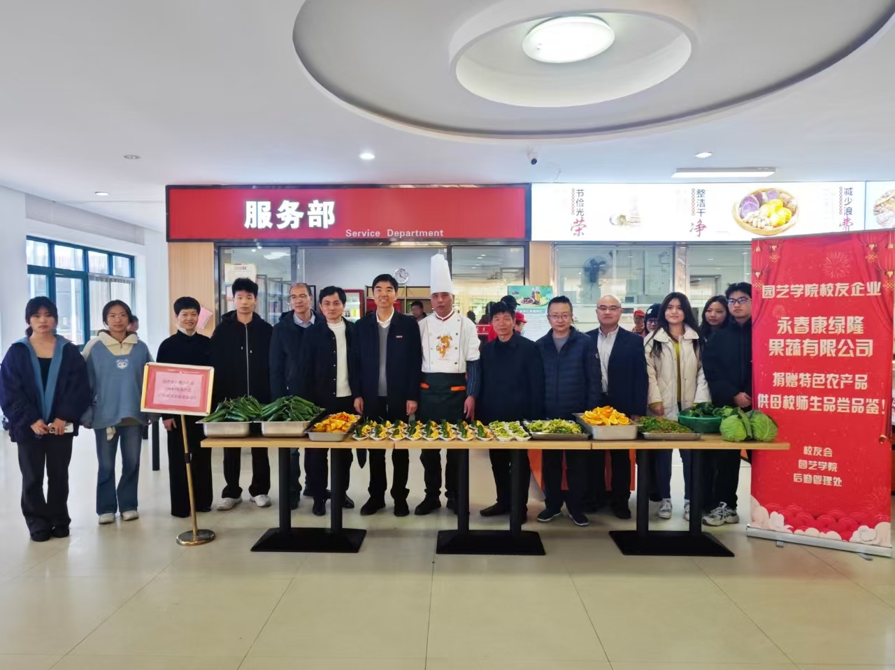 元旦前夕,在校领导的亲自推动下,校友会、园艺学院、后勤管理处携手校友企业永春康绿隆果蔬有限公司开展爱心捐赠果蔬师生免费品尝活动。副校长林庆藩,校友会、园艺学院、后勤管理处等单位相关负责同志到场指导,园艺学院相关专业在校博硕士研究生和本科生代表等一同参加。