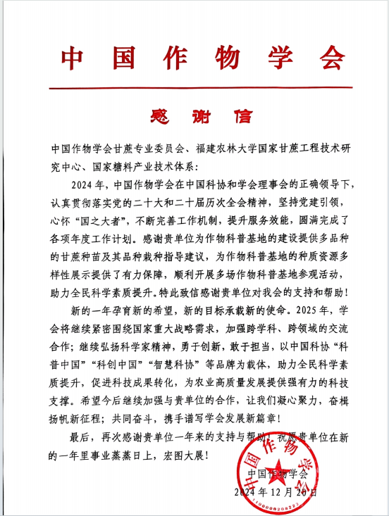 近日,中国作物学会向依托我校的甘蔗专业委员会、国家甘蔗工程技术研究中心等单位发来感谢信。这是中国作物学会第五年来信,感谢信提到:开云网页版有关单位为作物科普基地的建设提供多品种的甘蔗种苗,并做栽种指导,为作物科普基地的种质资源多样性展示和作物科普基地多场活动的顺利开展提供了有力保障。新的一年希望继续加强与我单位的合作,凝心聚力、共同奋斗,携手谱写发展新篇章。