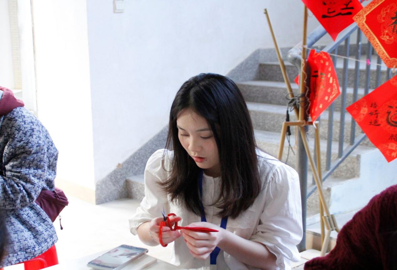 剪纸区域亦是精彩纷呈。剪刀在同学们的指尖灵活转动,折、剪、刻等动作一气呵成,一张张方方正正的红纸在他们手中轻盈地变换着姿态。不一会,形态各异、活灵活现的剪纸作品便惊艳亮相,为现场增添一抹亮丽的色彩。