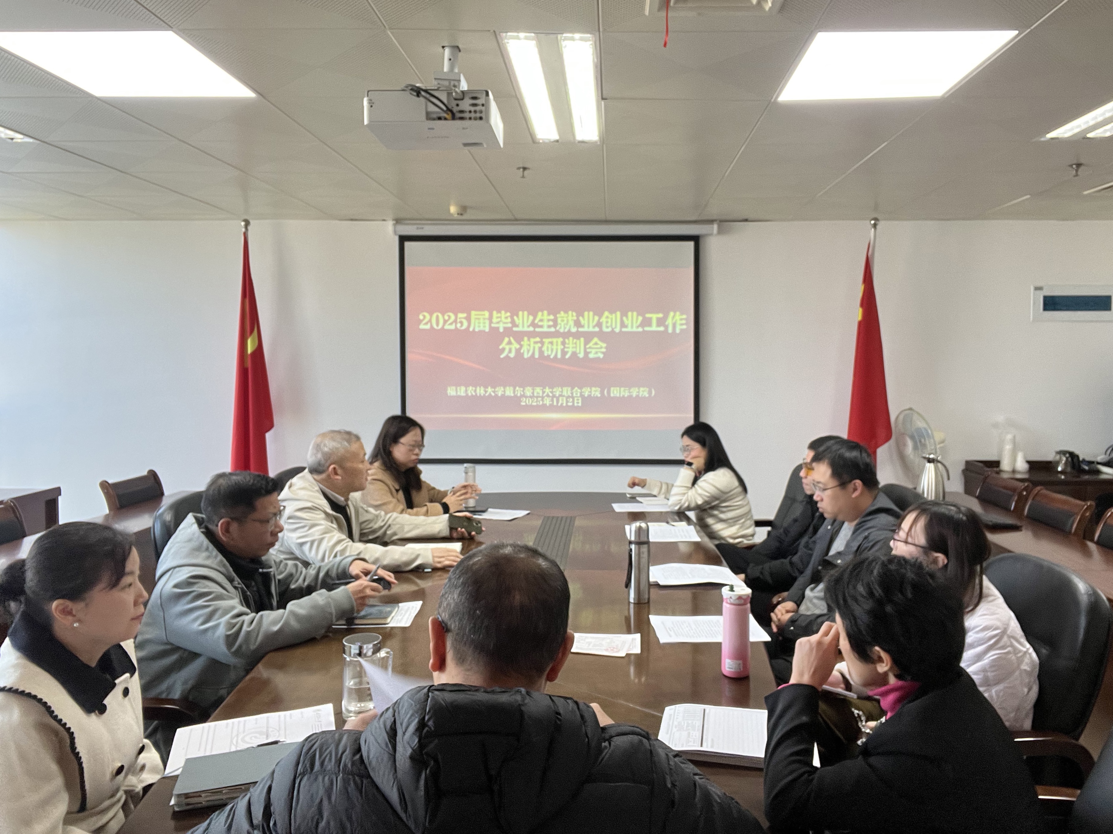 为扎实推进2025届毕业生就业创业工作,1月2日,戴尔豪西大学联合学院(国际学院)召开就业创业工作分析研判会。会议由学院党委副书记刘敏主持,学院领导班子成员、外语系正副主任、MTI教育中心主任、毕业班辅导员及班主任参加会议。