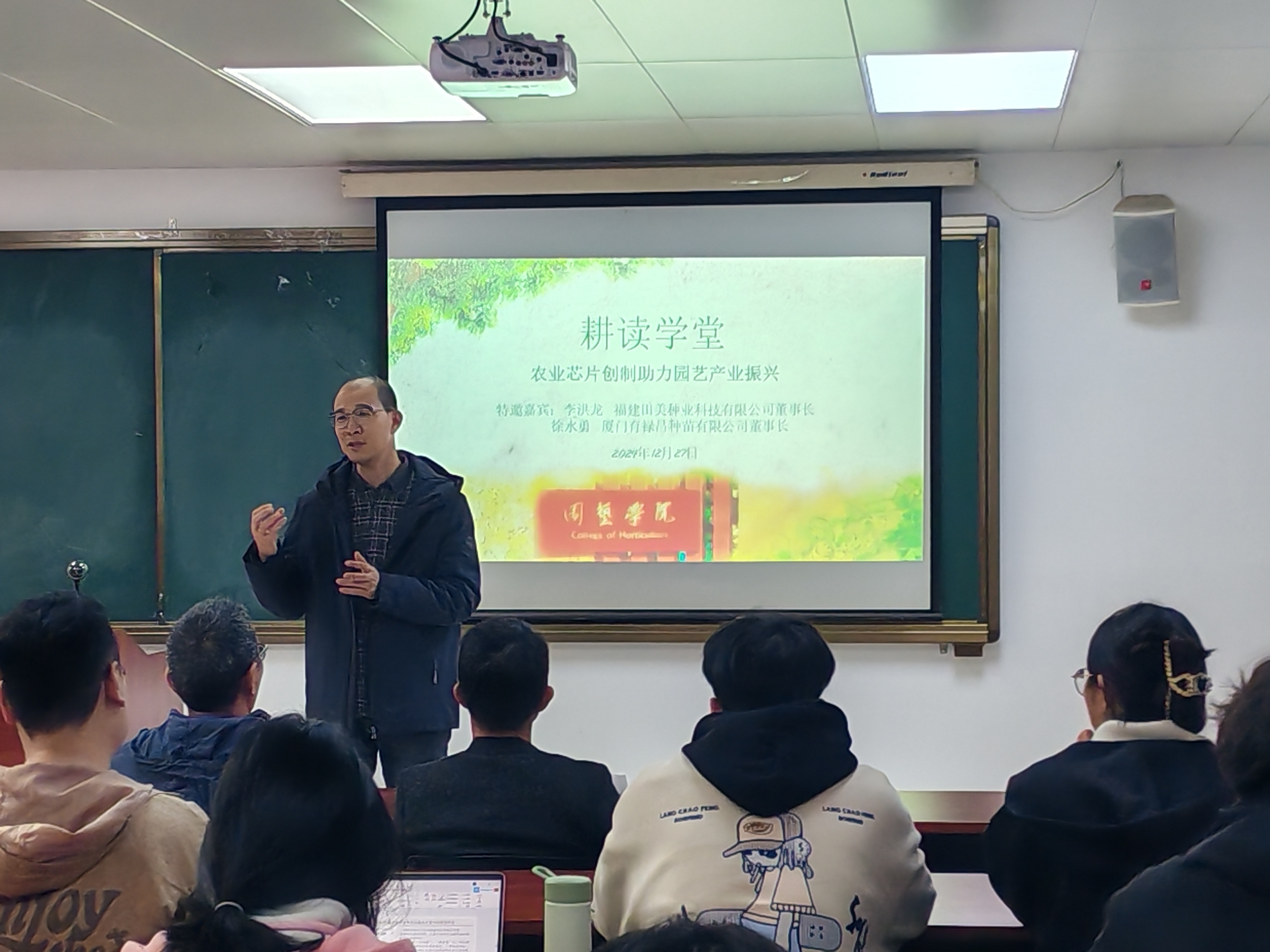 12月27日,园艺学院举办第二期耕读课堂活动,聚焦“农业芯片创新助力园艺产业振兴”这一主题,旨在探讨园艺产业的最新发展动态。本次活动特邀福建田美种业科技有限公司董事长李洪龙及厦门育禄昌种苗有限公司董事长徐水勇主讲,学院副院长钟凤林主持,学院党委副书记康恩慧、辅导员罗冰筠及四十多名本科生、研究生参加会议。