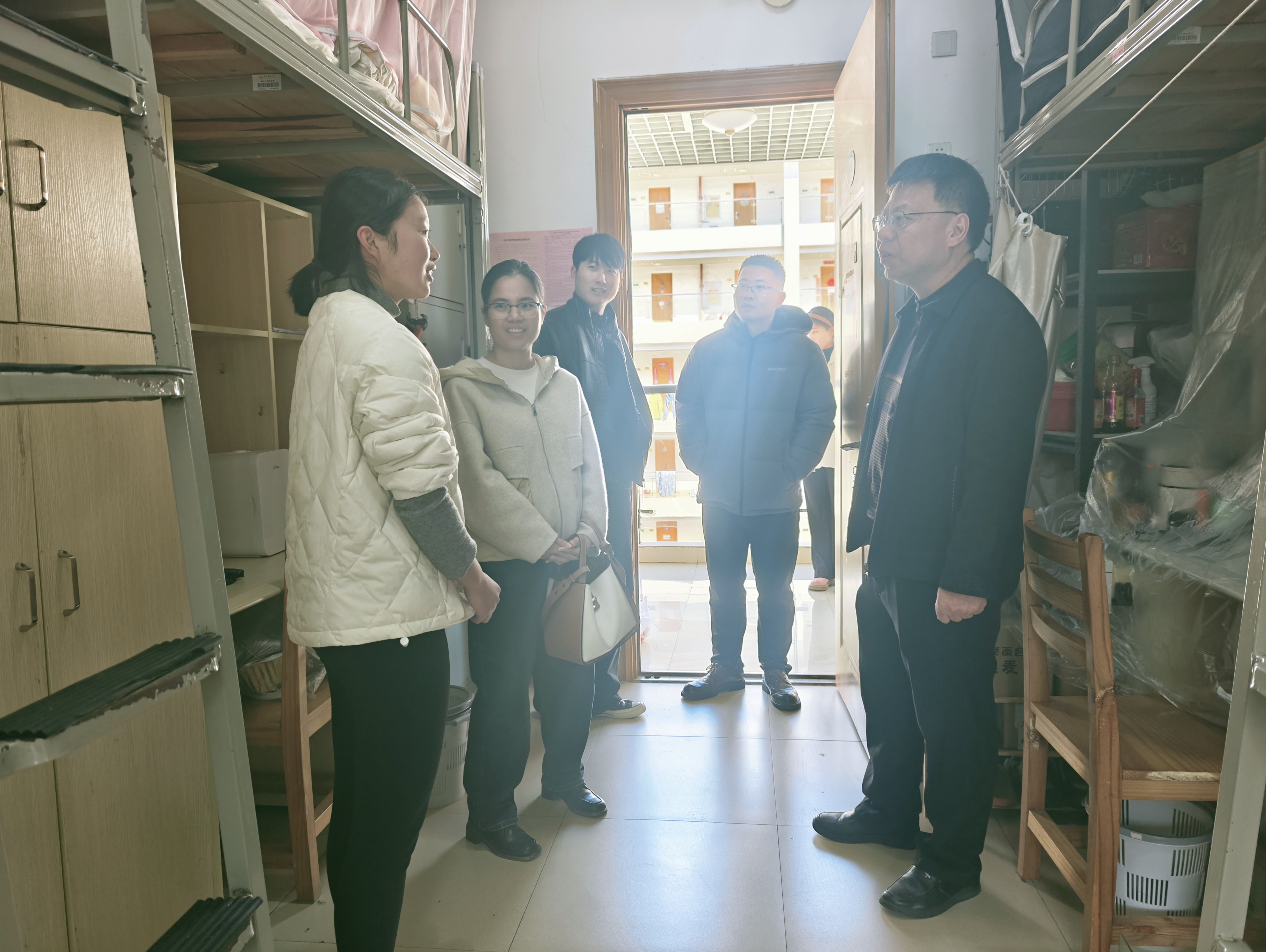 1月10日,材料工程学院党委副书记郭朝晖带领政工干部一行深入学生宿舍进行期末安全文明检查。