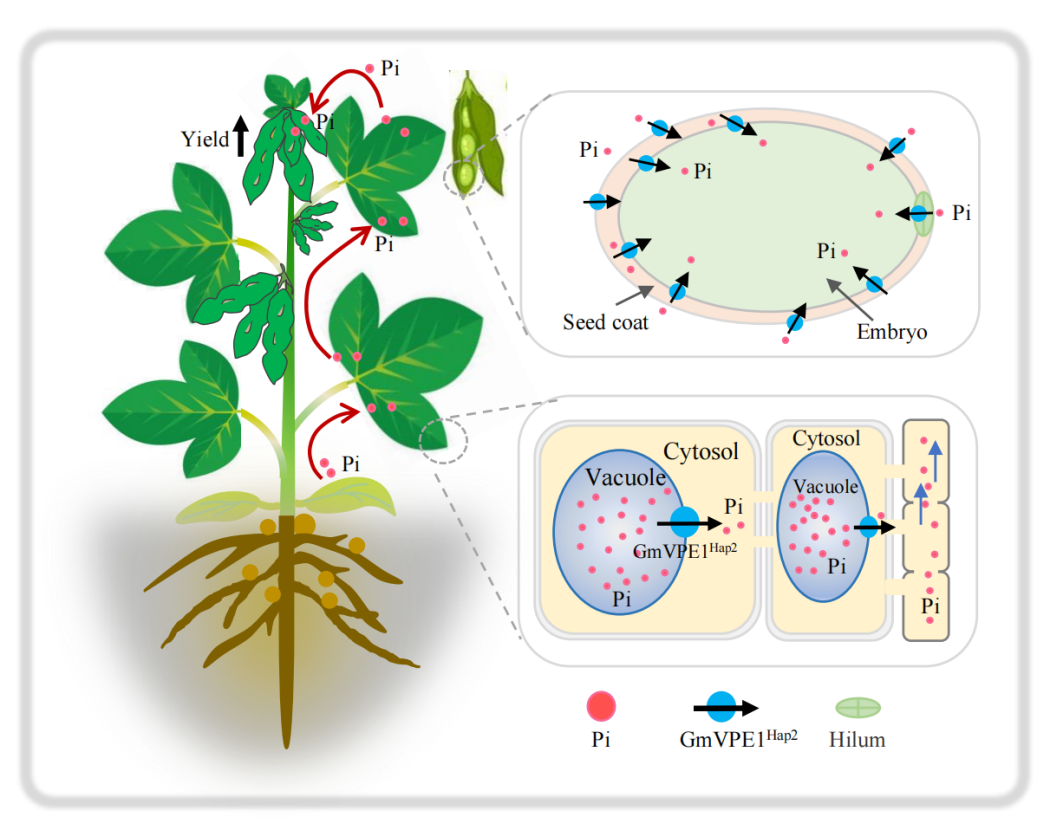 磷是植物生长发育的必需大量营养元素,植物通过提高磷的吸收效率 (PAE) 和磷利用效率 (PUE) 来实现高产。其中,植物的PUE主要取决于磷在不同器官和组织中的再活化、再转运和再利用。虽然增强PAE和PUE均能提高作物磷效率,但很多研究集中于PAE,有关植物PUE的研究相对较少。液泡是绿色植物用来储存磷素的主要细胞器,当外界磷素缺乏时,液泡储存的无机磷会被释放到胞质中供植物利用。因此,液泡中磷素的分配周转及再利用与作物磷利用效率 (PUE) 密切相关,然而,在大豆中的相关遗传分子机制研究还相对有限。