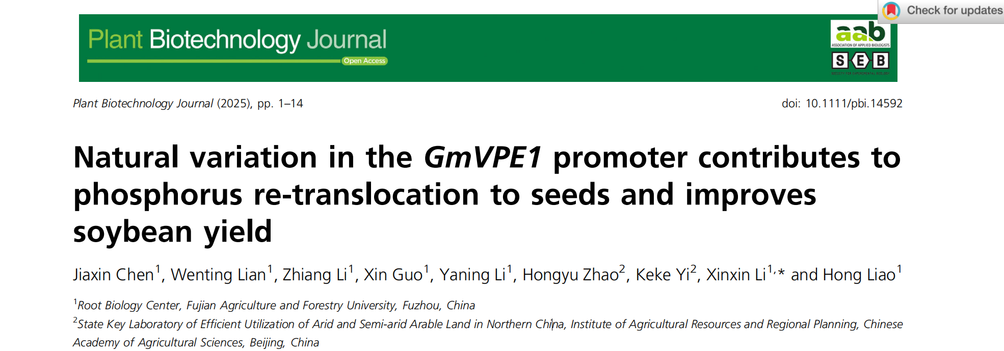 近期,《植物生物技术杂志》Plant Biotechnology Journal在线发表了我校根系中心廖红团队李欣欣课题组题为“Natural variation in the GmVPE1 promoter contributes to phosphorus re-translocation to seeds and improves soybean yield”(GmVPE1启动子变异对磷向种子再分配及大豆产量的贡献)的研究论文,发现了GmVPE1启动子区的自然变异与大豆产量显著相关,促进了磷从营养器官到生殖器官的再分配,显著影响了磷转移/再分配和种子发育,进而提高大豆产量。
