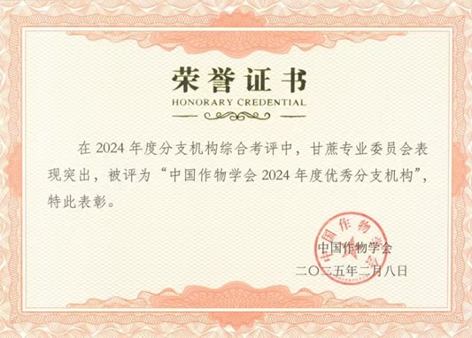 近日,中国作物学会对下属分支机构进行2024年度综合考核,分别评选出5家“TOP5优秀分支机构”和2家“优秀分支机构”,其中依托我校甘蔗专业委员会被授予“中国作物学会2024年度优秀分支机构”光荣称号。甘蔗专业委员会已连续两年获此殊荣。