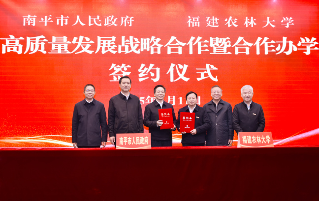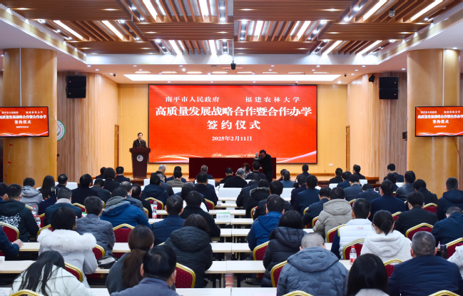 赖海榕代表学校致辞。他指出,南平是生态大市、农业大市和林业大市,我校作为福建省唯一的农林本科高校,办学定位、学科优势特色与南平市经济社会发展需求高度契合,双方在人才培养、产教融合、产业发展、乡村振兴等方面具有广阔的合作前景。他表示,此次高质量发展战略合作暨合作办学,是市校双方面向未来发展,共同开创发展新机遇、谋求发展新动力、拓展发展新空间的主动战略选择。这既是全面贯彻落实教育强国和教育强省建设规划纲要目标任务,持续扩大高等教育学位供给的实际行动,也是深化校地合作,全面提升高等教育服务南平高质量发展能力,促进资源共享、优势互补,实现合作共赢、融合发展的生动实践。他期待双方共同努力,携手把合作办学推进到更高的层次,为南平市打造全国绿色高质量发展重要增长极注入新动力,为我校加快建设农林特色鲜明全国一流大学增添新势能,为奋力谱写中国式现代化福建篇章作出新的更大贡献。