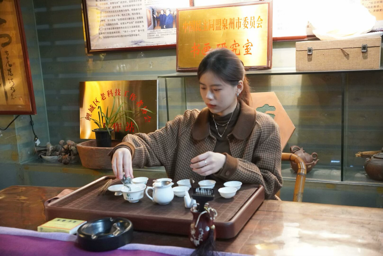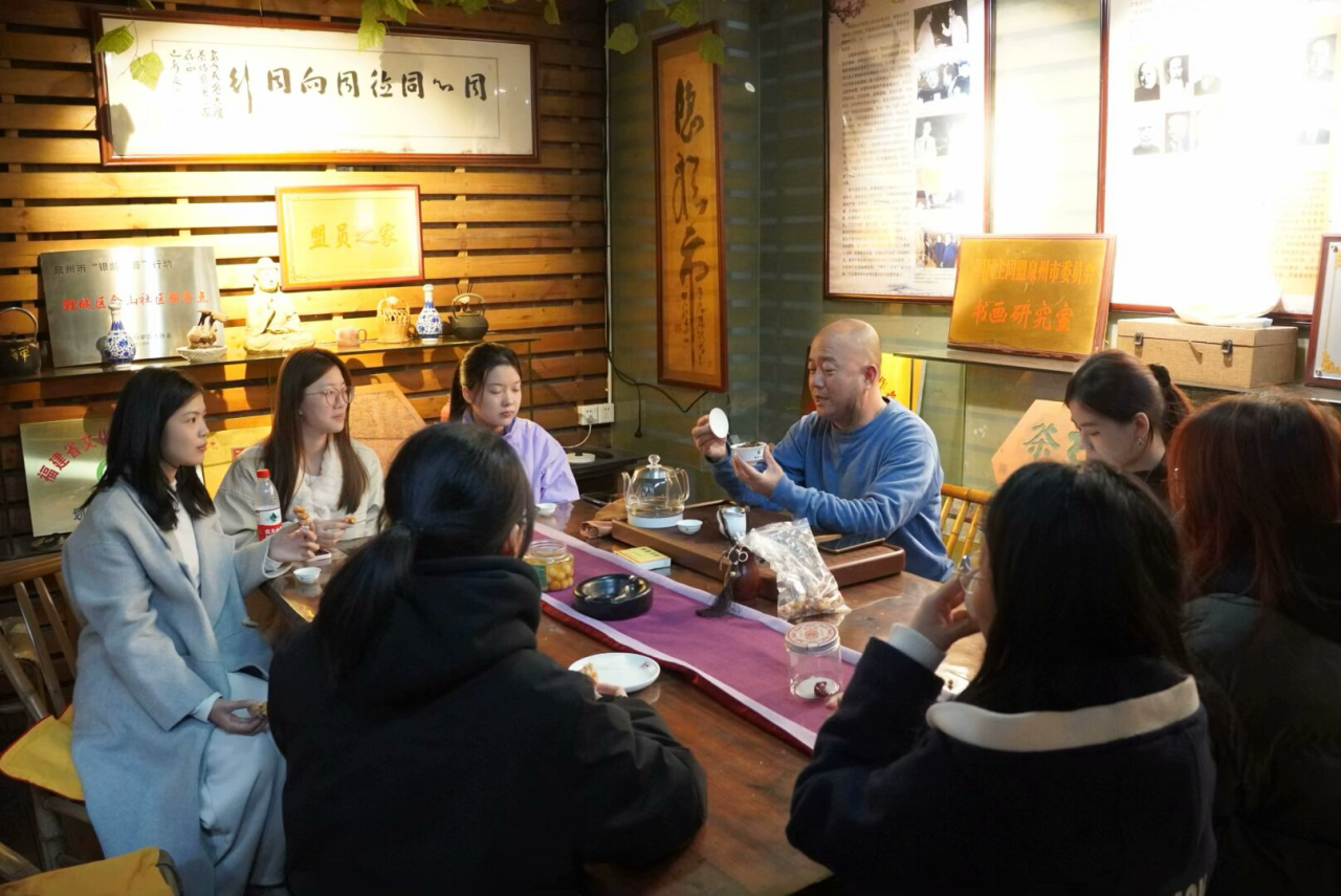 实操冲泡技艺,品味闽南茶道。为更加深入地了解泉州当地人对于非物质文化遗产制茶文化的理解,实践队走进古厝茶馆调研,通过实地参观与交流,亲身体验学习等方式探索闽南泡茶技艺的传承发展史,茶馆负责人深入浅出地介绍了茶馆的悠久历史渊源与茶文化传承的壮丽图景,并展示了烫杯、置茶、注水等步骤,每一个动作都透露出对茶的尊重和热爱。在泡茶的过程中,负责人还与实践队互动,解答实践队的疑问,让实践队更加深入地了解了泡茶技艺的精髓。