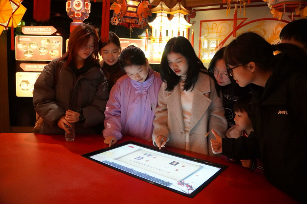参观非遗瑰宝,探索“文化+科技”新模式。为更深入了解非物质文化遗产,实践队员们走进了泉州市非物质文化遗产馆,在这里逐一领略民间文学、传统音乐、传统舞蹈、传统戏剧、曲艺、传统体育、游艺与杂技、传统美术、传统技艺、传统医药及民俗等丰富多彩的泉州非物质文化遗产代表性项目及代表性传承人的匠心之作,特别关注了非物质文化遗产展馆中现代科技与传统非物质文化遗产的结合。展馆巧妙地将现代科技元素融入了许多非物质文化遗产项目的展示中,使得非物质文化遗产焕发出了新的生机与活力。通过3D动态展示图、答题点亮非遗花灯等有趣的互动方式,实践队成员不仅更深入地了解了非物质文化遗产知识,更感受到了泉州非物质文化遗产的魅力与温度。