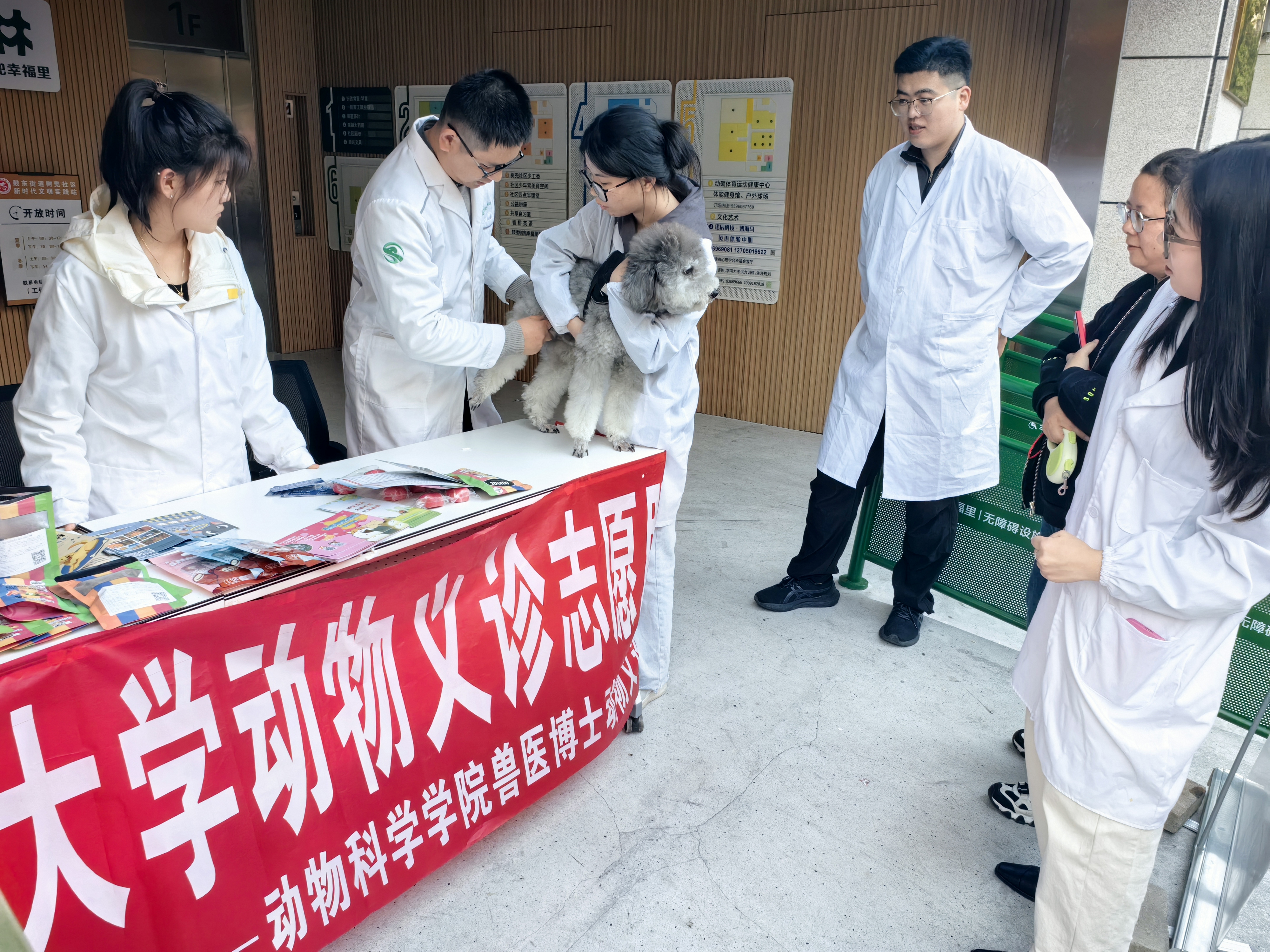 志愿活动由动物医学专业老师郭盼盼博士带领的博士志愿服务团,通过精准诊疗和科普宣传相结合的方式,为社区居民的宠物提供全方位的健康服务。在社区活动中心设立的宣传点内,团队创新性地采用了“科普+诊疗”的服务模式,现场发放《科学养宠手册》150余份,重点讲解了宠物营养均衡方案、定期驱虫标准以及行为训练技巧等内容。此外,特别设置了“你问我答”互动环节,耐心解答居民关于宠物疫苗接种、绝育时机等具体问题,帮助他们提升科学养宠意识。