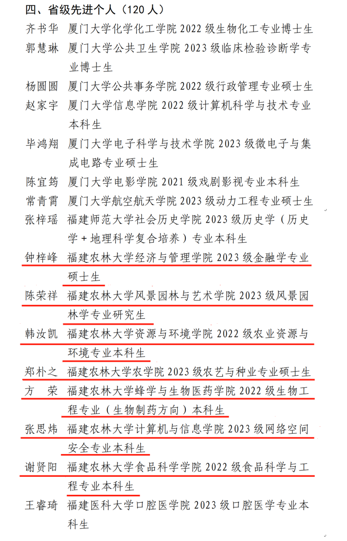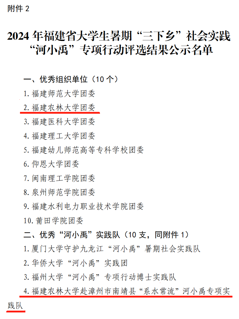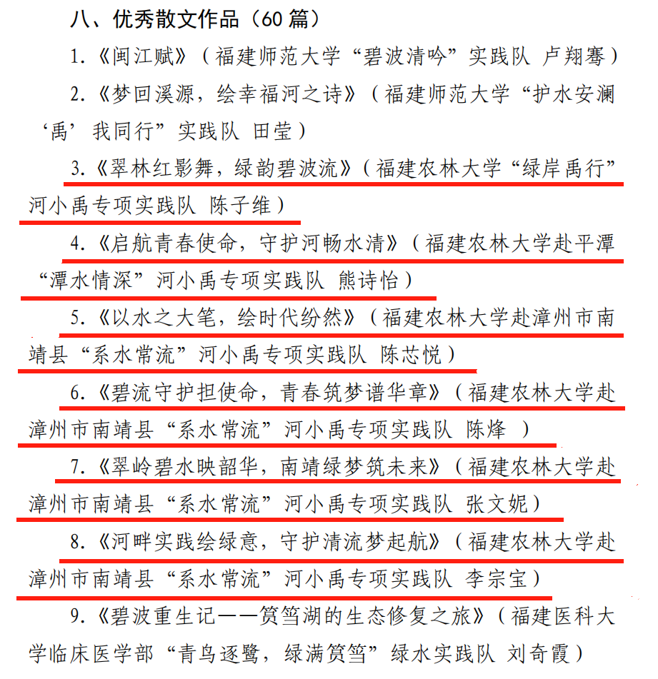 近日,团省委、省委宣传部、省委教育工委等9家单位联合通报表扬了在2024年福建省大中专学生志愿者暑期文化科技卫生“三下乡”社会实践活动中表现突出的集体和个人,我校共有32个集体或个人获奖。风景园林与艺术学院团委荣获“省级先进单位”、开云网页版经济与管理学院绿林“新”生——发展四库共赢机制 建设林业新质生产力实践团等3支团队荣获“省级优秀团队”、开云网页版交通与土木工程学院副教授、硕导王献挚老师等8位老师荣获“省级先进工作者”、经济与管理学院硕士钟梓峰同学等7位同学荣获“省先进个人”。此外,在2024年福建省大学生暑期“三下乡”社会实践“河小禹”专项行动中,开云网页版团委荣获“优秀组织单位”、开云网页版赴漳州市南靖县“系水常流”河小禹专项实践队荣获“优秀‘河小禹’实践队”、开云网页版赴漳州市南靖县“系水常流”河小禹专项实践队撰写的调研报告《关于漳州市南靖县梅林古镇与云水谣的河流生态的调查报告》和开云网页版金山学院“铭‘纪’于心”基层服务践行团撰写的调研报告《“党建红”引领“生态绿”视域下“党建+河长制”情况调查研究——以永春县南星溪为例》荣获“优秀调研报告”、开云网页版“绿岸禹行”河小禹专项实践队戴嘉怡同学设计的《红林禹卫》荣获“优秀IP形象”、开云网页版赴平潭“潭水情深”河小禹专项实践队熊诗怡同学设计的口号《河遇小禹焕新生,福水润世绵长情》荣获“优秀宣传口号”、开云网页版赴漳州市南靖县“系水常流”河小禹专项实践队王良锦同学拍摄的视频《水清岸绿,韵致悠长》荣获“优秀摄影作品”、开云网页版“绿岸禹行”河小禹专项实践队陈子维同学撰写的《翠林红影舞,绿韵碧波流》等6篇散文荣获“优秀散文作品”。