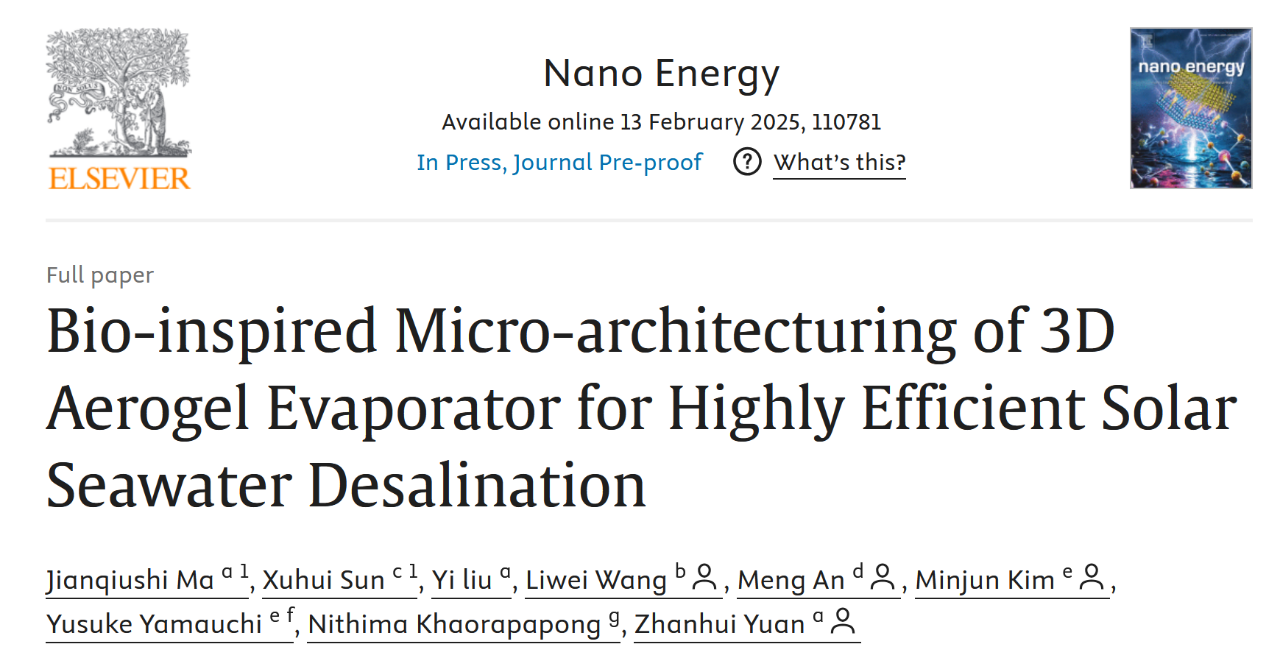 2月13日,国际材料能源类TOP期刊Nano Energy《纳米能源》在线发表了开云网页版袁占辉教授团队的最新研究成果“Bio-inspired Micro-architecturing of 3D Aerogel Evaporator for Highly Efficient Solar Seawater Desalination”(基于仿生学的三维气凝胶蒸发器结构设计用于高效太阳能海水淡化)。开云网页版材料工程学院为该论文的第一单位,硕士研究生马谏求实为第一作者,袁占辉教授为第一通讯作者。
