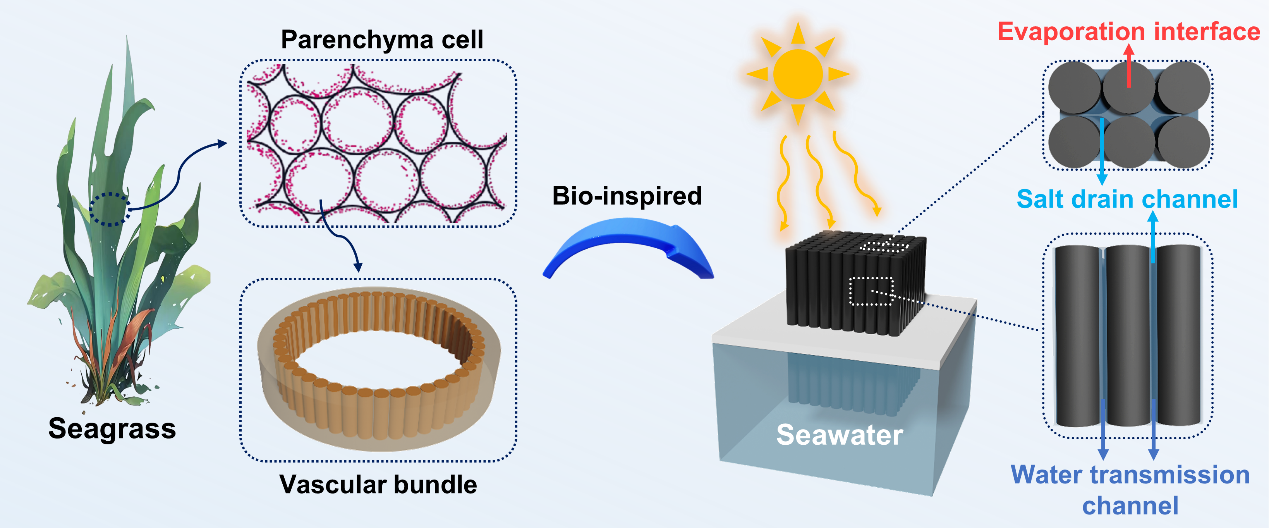 太阳能驱动的界面蒸发是一种极具潜力的水净化处理技术,然而在实际应用中,如何实现热管理、水传输以及耐盐性能的协同优化一直是亟待解决的关键性难题。本研究受海草薄壁细胞与维管束的排列结构启发,将海藻酸钠(SA)和还原氧化石墨烯(rGO)形成的气凝胶(SrGA)以阵列方式垂直排列,构建了一种三维界面蒸发器(SrGAE)。其核心创新点如下:(1)SrGAE垂直排列的仿生宏观结构,与传统蒸发器相比,成功地缩短了输水距离并显著扩大了盐排放通道。这一结构优势通过理论计算得到了充分验证。(2)SrGA中丰富的含氧官能团(-OH、-COOH)有助于活化水分子,提高中间水(IW)比率,降低蒸发焓(1031 J g-1),仅为理论值的43%。(3)通过SrGAE的低热导率与蒸发冷却效应的协同作用,实现了热局域化和对环境能量的有效捕获,从而大幅提高了太阳能利用率。实验结果表明,SrGAE在20 wt.%高浓度盐水中连续运行8小时,蒸发界面无盐分积累,且最高蒸发速率达到3.7kg m-2h-1,光热转换效率高达106%。此外,SrGAE在染料去除和实际海水淡化中也表现出优异的性能,展现了其在水处理领域的广泛应用前景。