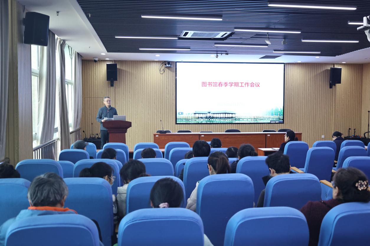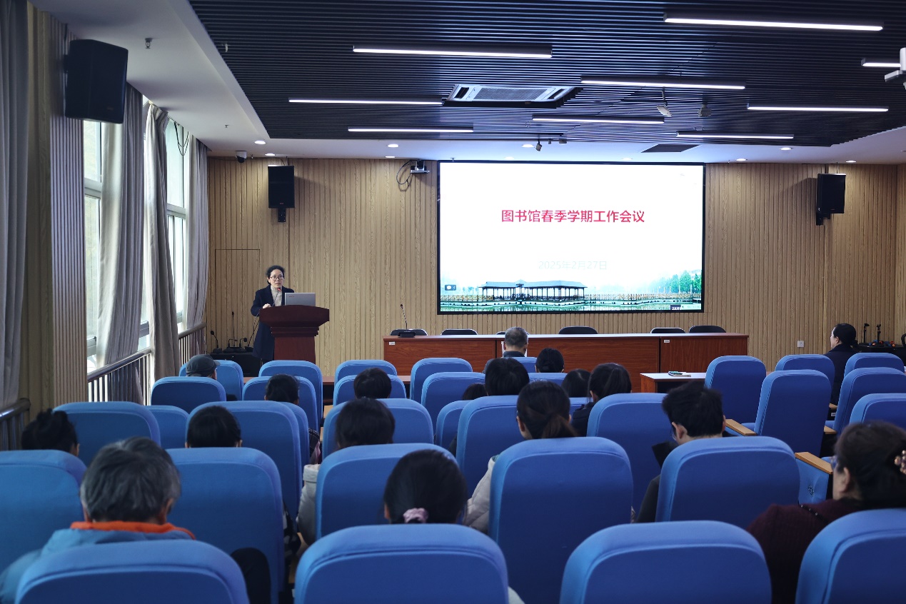 2月27日下午,图书馆在逸夫图书馆二楼视听阅览室召开会议,传达学校2025年春季学期工作会议精神并部署新学期工作,全体教职工参加。会议由图书馆党委书记陈月霄主持。