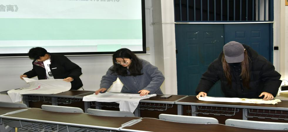 分享会上,陈玲凤以“生活美学与实用收纳”为主题,结合宿舍空间规划、物品分类整理等场景,系统讲解了收纳技巧。她通过案例演示和互动问答,指导学生利用有限空间实现高效收纳,并强调“收纳不仅是整理物品,更是培养生活秩序感的重要方式”。现场还设置了实操环节,学生代表通过折叠衣物、归置学习用品等实践,直观体验了收纳带来的便捷性。陈玲凤还邀请同学们参加“直立法收纳大比拼”,大家在实践中回顾了直立收纳技巧,巩固了学习成果,掌握了新技能也收获了整理收纳的成就感。