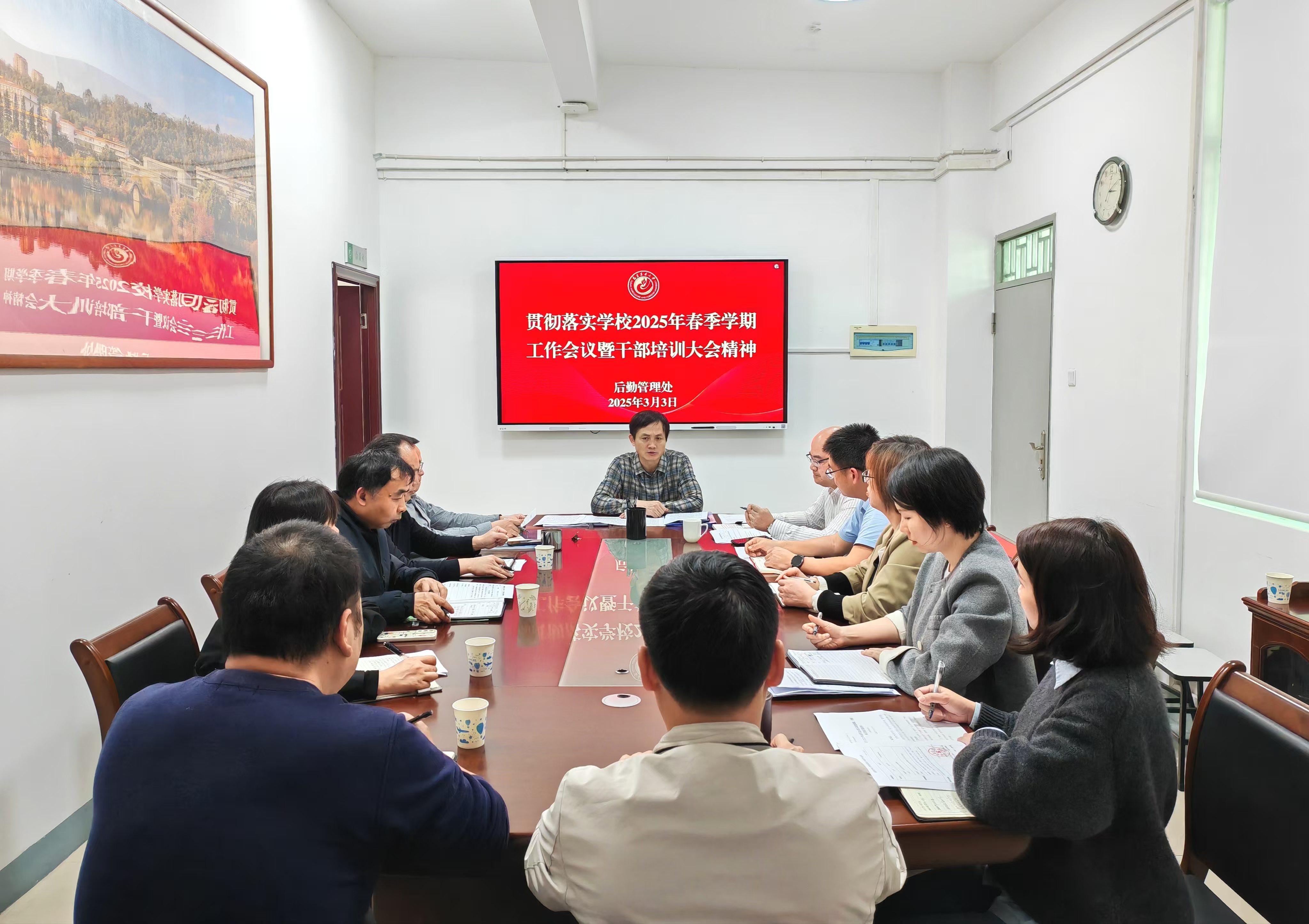 3月3日,后勤管理处召开专题会议,深入贯彻落实学校2025年春季学期工作会议暨干部培训大会精神,围绕“对标一流、争先进位,为师生创造更高品质校园生活”目标,部署新学期后勤高质量发展重点工作。后勤管理处全体处科级干部参会,处长刘胜主持会议。