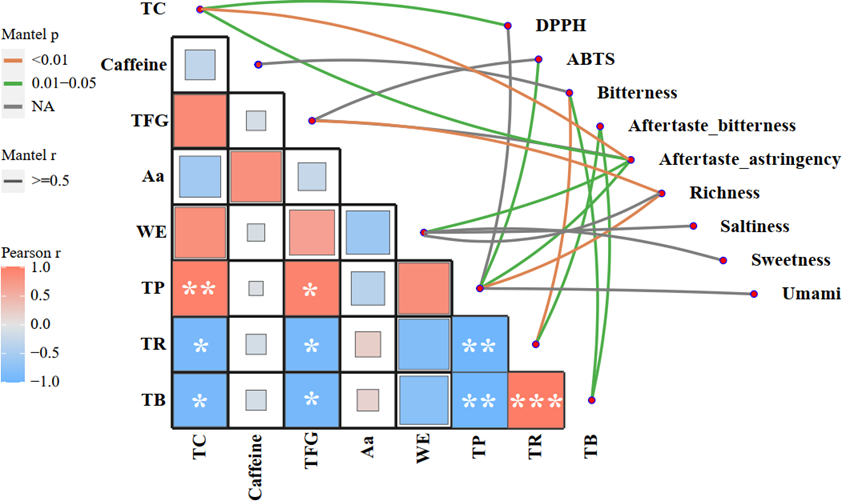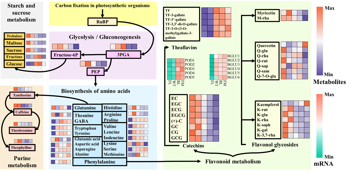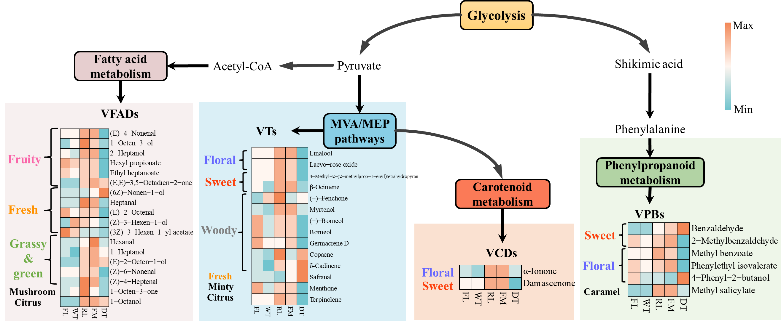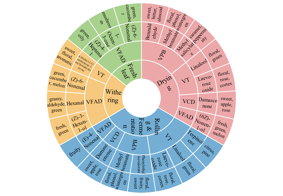 研究利用代谢组学、转录组学、GC-O-MS、电子鼻和电子舌等技术,检测在加工过程中的海南大叶种红茶化学风味特性和香气特征的形成。研究发现,海南大叶种鲜叶中有较为丰富的咖啡碱和氨基酸成分;在加工过程中形成并富集了苯甲醛,大马酮,芳樟醇和甲基水杨酸,使大叶种红茶具备浓郁花果香和甜香。同时,加工过程中的游离氨基酸的积累和总儿茶素、黄酮醇苷的减少,内含物的相互协同作用形成了海南大叶种红茶醇厚鲜爽的滋味特征,使得其具备抗氧化能力。本研究揭示了海南大叶种红茶的风味化学基础和形成机制,对海南大叶种红茶加工和产业发展具有重要的指导意义。