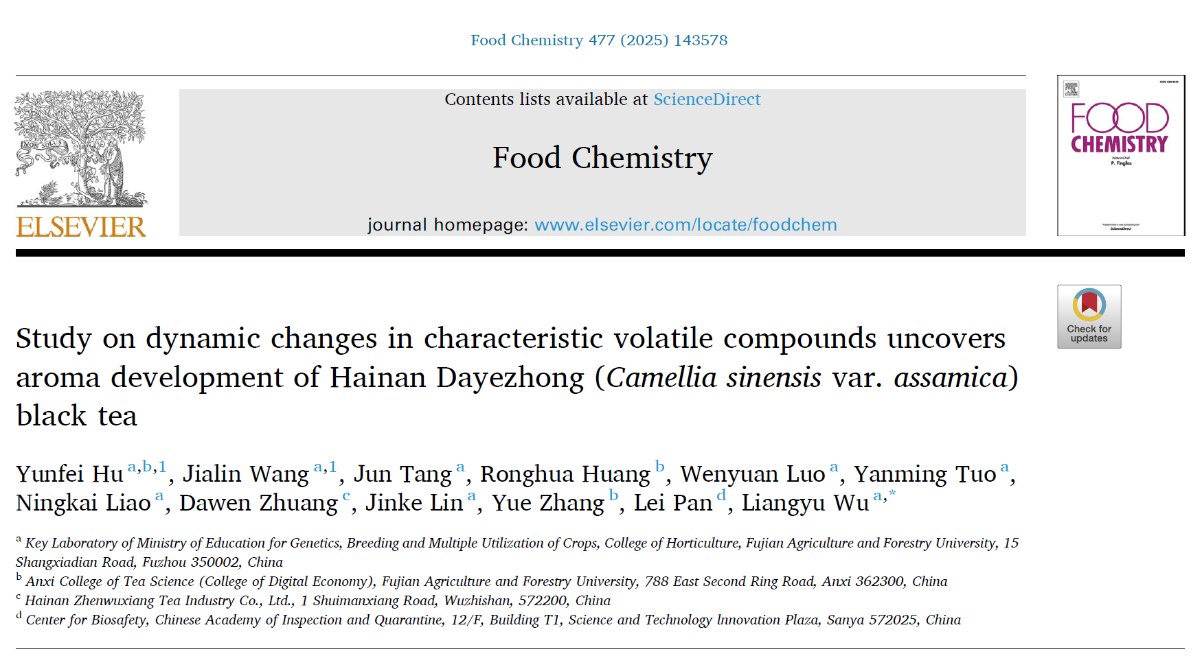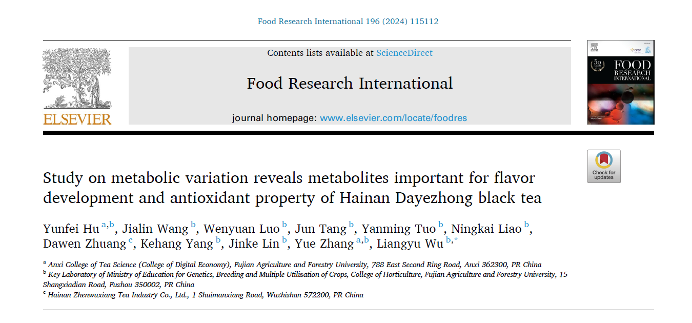 近日,我校茶学教师胡雲飞、吴亮宇团队在长期开展科技特派员工作过程中,围绕海南大叶种红茶加工品质形成的机制研究,连续在国际权威期刊Food Research International(《国际食品研究》)发表了题为“ Study on metabolic variation reveals metabolites important for flavor development and antioxidant property of Hainan Dayezhong black tea” (代谢变化揭示了代谢产物对海南大叶种红茶风味形成和抗氧化特性的研究)和 Food Chemistry(《食品化学》)发表了“Study on dynamic changes in characteristic volatile compounds uncovers aroma development of Hainan Dayezhong (Camellia sinensis var. assamica) black tea” (海南大叶种红茶特征挥发性成分动态变化揭示了海南大叶种红茶香气形成的研究)的研究论文。