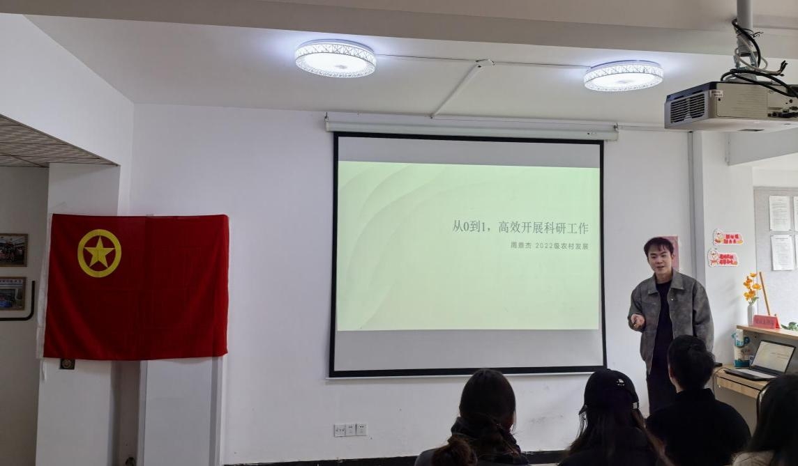 为充分发挥优秀学子的示范引领作用,激励研究生在学术研究与职业发展中勇攀高峰,3月6日晚,乡村振兴学院在东苑“一站式”学生社区领航驿站举办“学长与你话成长——我是如何获得国家奖学金”主题分享会。活动邀请2024年度国家奖学金获得者周鼎杰分享他个人的科研经验与成长历程,剖析了科研之路的内在逻辑以及成长背后的内驱力,助力同学们锚定前行目标,在科研之路上扬帆远航。学院辅导员邱雍华及2024级农村发展2班的同学们参加了本次活动。