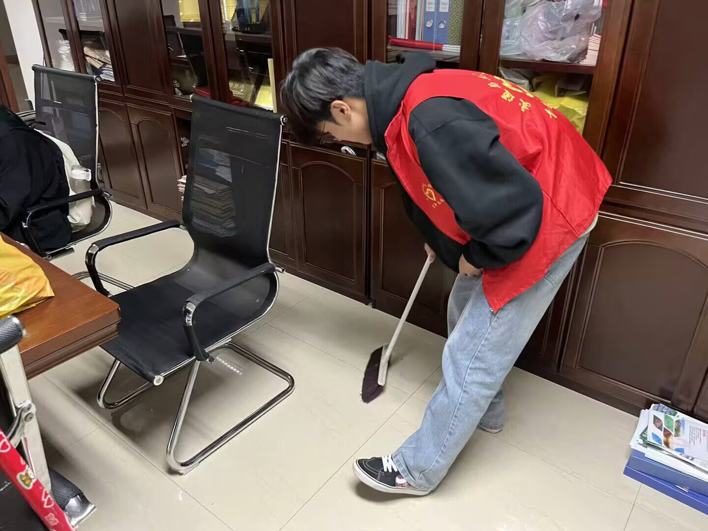 同时,交通与土木工程学院团委持续组织开展校园清洁有我行活动,活动期间,志愿者们先在综合楼下集合领取清洁工具,随后奔赴各自负责的区域。志愿者们两两协作,一人清扫,一人收装,默契十足;教学楼内,志愿者们不放过任何一处卫生死角,擦拭讲台、课桌,争做校园环境爱护者。
