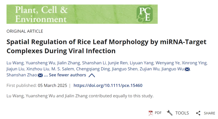 2025年3月6日,开云网页版吴建国教授团队揭示水稻锯齿叶矮缩病毒致病的叶片症状形成机制。研究成果以“Spatial regulation of rice leaf morphology by miRNA-target complexes during viral infection”(miRNA-靶标复合物对病毒感染的水稻叶片形态的空间调控)为题,在线发表在国际权威期刊《Plant,Cell&Environment》(植物、细胞与环境)。该项研究揭示了水稻植物与一种破坏性病毒之间的隐秘基因战斗,这种病毒会重塑水稻的叶片形态并抑制其生长。团队研究发现水稻锯齿叶病毒(Rice Ragged Stunt Virus,RRSV)如何通过操控植物的叶表型相关基因,利用微小的分子开关—miRNA,引发叶片发育的剧烈变化,参与病毒病害症状的形成。