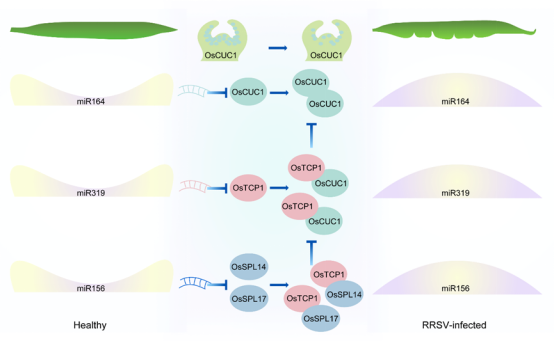 感染RRSV的水稻植株通常表现植株矮化、分蘖增多、叶片浓绿僵、叶尖卷曲和叶缘锯齿状缺刻等病害症状,但其背后的分子机制却长期未被揭示。该项研究找到了“罪魁祸首”:RRSV通过操控几种关键miRNA(miR164、miR319和miR156)及其对应的靶基因(CUC、TCP和SPL),干扰了正常水稻叶片发育的调控机制。在健康水稻中,这些miRNA通过精确调控细胞生长和器官形成相关基因,确保叶片保持正常的形态和大小。然而,病毒感染会导致这些miRNA的表达模式发生显著改变,进而破坏其调控平衡。具体来说,miR164的表达显著下降,导致其靶基因OsCUC1的表达增强,扰乱了叶片边缘的正常形成,最终引发叶缘锯齿状缺刻。miR319在感染后显著上调,抑制了与植物抗病相关的茉莉酸信号通路,从而加剧了病毒的侵染。与此同时,miR156的表达升高,干扰了水稻从营养生长到生殖生长的转变过程,导致植株矮化分蘖增多,并延迟成熟。这一研究不仅揭示了RRSV如何通过精细调控宿主miRNA网络来操控叶片发育,还为培育具有更强抗病毒能力的水稻品种提供了新的分子靶点和理论依据。
