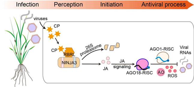 研究发现,水稻体内存在一种名为RBRL(RING1-IBR-RING2类型的泛素连接酶)的蛋白,它不仅能够识别水稻条纹病毒(RSV)的外壳蛋白(CP),还能够识别水稻矮缩病毒(RDV)的外壳蛋白P2。这一发现表明,RBRL在水稻抗病毒免疫系统中充当“前哨”角色,能够广谱感知不同类型的病毒入侵。进一步研究显示,RSV的外壳蛋白CP能够诱导RBRL的表达增加,并激活其泛素连接酶活性。RBRL随后介导茉莉酸信号通路抑制因子NINJA3(NOVEL INTERACTOR OF JAZ 3)的泛素化和降解,从而激活水稻的茉莉酸信号通路,增强植物的抗病毒能力。