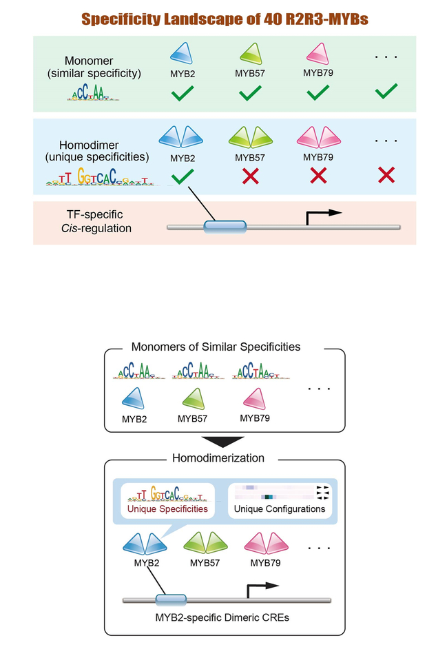 本研究系统测定了VIII亚族R2R3-MYBs的DNA序列特异性,发现同源二聚化使AtMYB2能够识别其他旁系同源因子无法结合的CREs,进而使AtMYB2激活独特的靶基因。以上机制揭示了真核生物TFs在进化过程中解决“特异性悖论”的一种新机制。同时也为育种中转录调控位点的编辑提供了新思路——通过编辑同源二聚体CREs,精准调控旁系同源TFs中特定成员的下游靶基因表达。