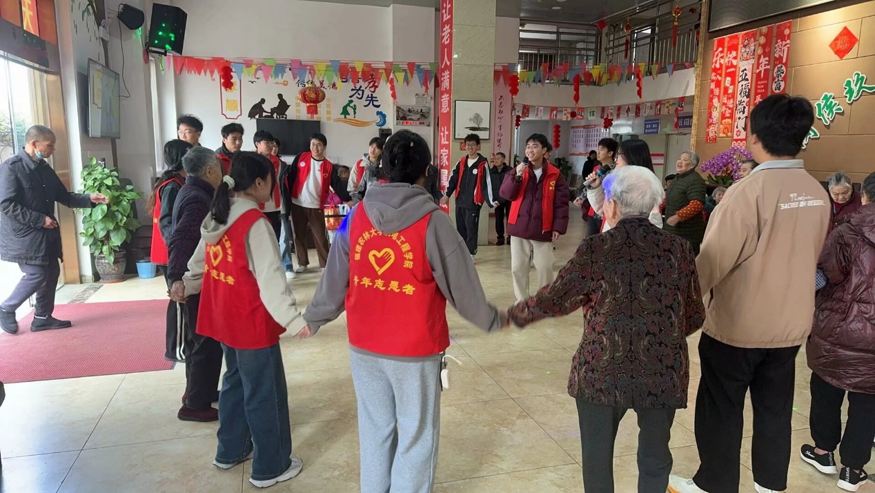 此外,志愿者们还精心准备了经典老歌合唱环节。《歌唱祖国》《南泥湾》等熟悉的旋律响起,老人们纷纷加入合唱,仿佛回到了青春岁月。志愿者们用欢快的舞步带动气氛,老人们也随着节奏轻轻摇摆,现场气氛热烈而温馨。