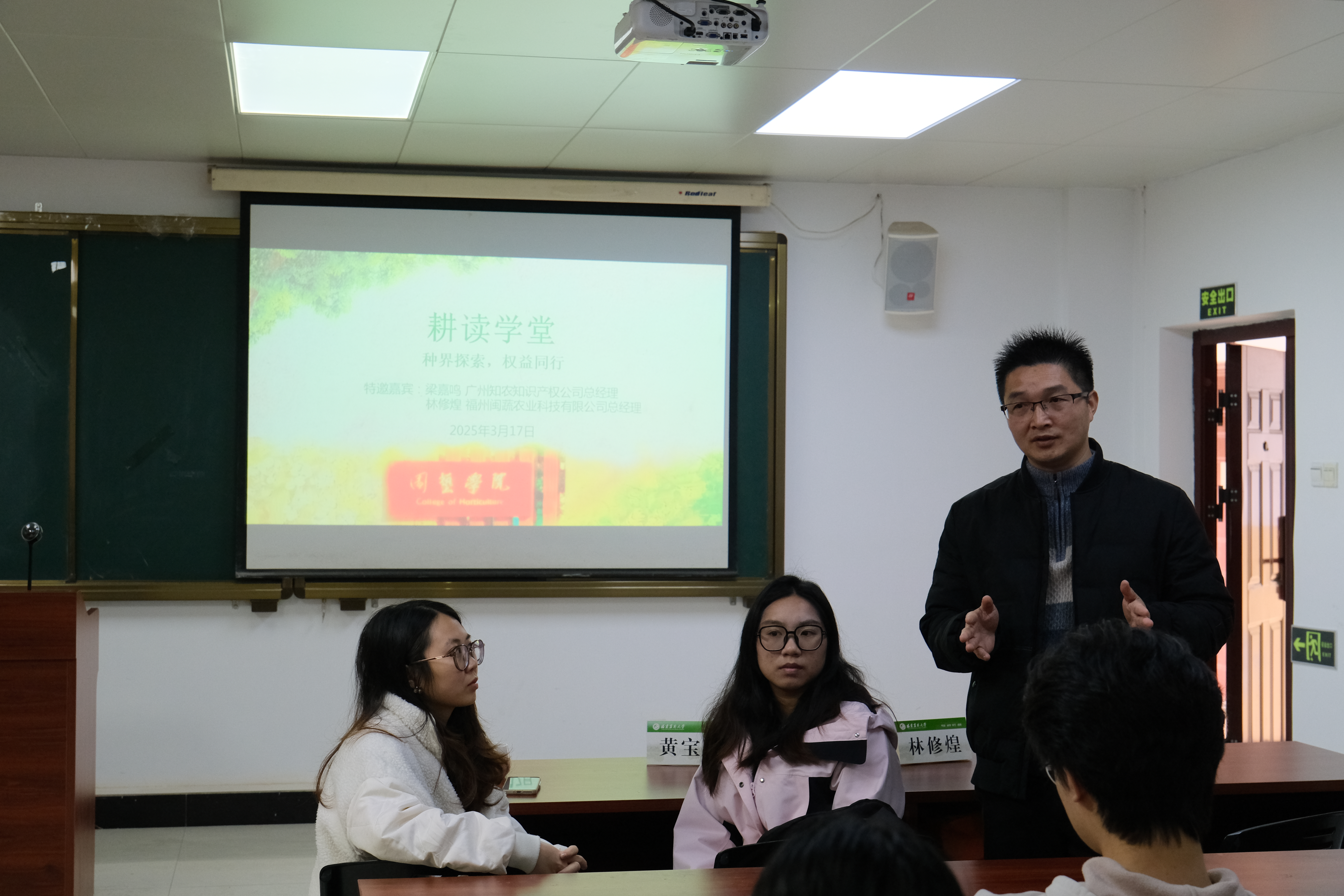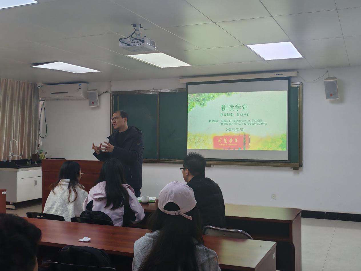 3月17日,园艺学院在园艺楼214教室举办“耕读学堂”第三期沙龙活动,本次活动以“种界探索,权益同行”为主题开展,邀请广州知农知识产权公司总经理梁嘉鸣女士与福州闽蔬农业科技有限公司总经理林修煌先生担任主讲嘉宾,学院副院长钟风林、辅导员、老师及本科生、研究生共40多人参加此次交流活动,活动由钟凤林主持。
