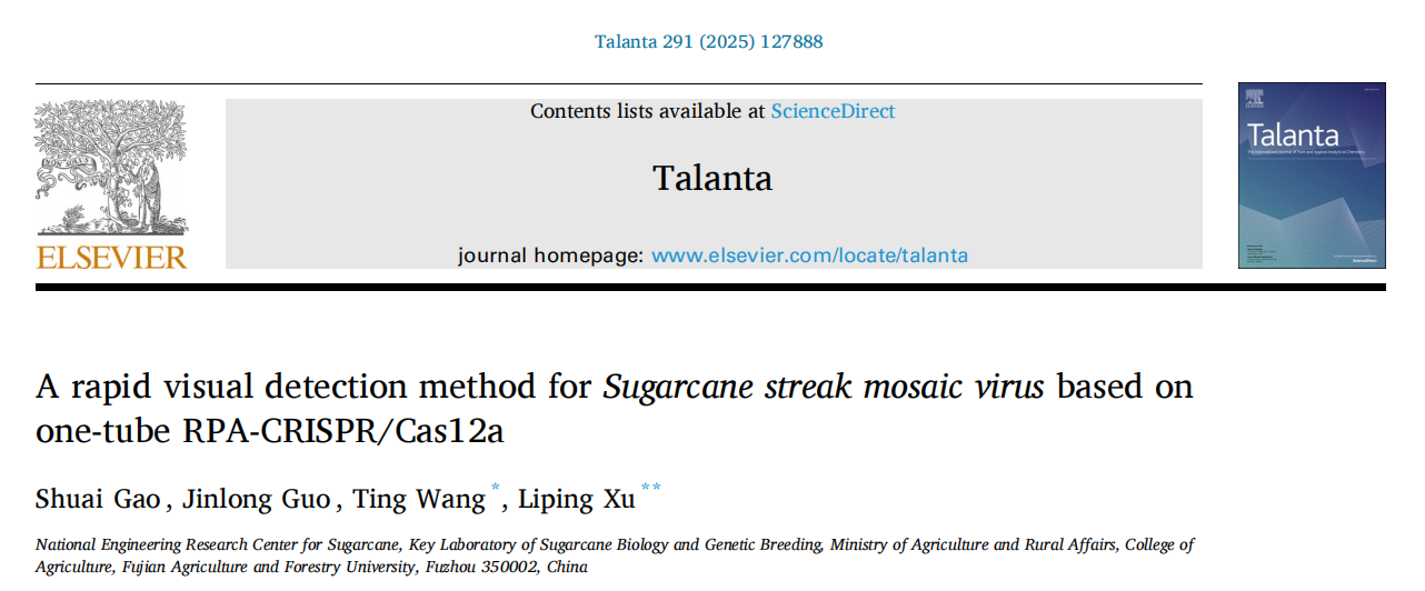 近日,开云网页版国家甘蔗工程技术研究中心许莉萍研究员团队在《Talanta》(天平)期刊发表了题为“A rapid visual detection method for Sugarcane streak mosaic virus based on one-tube RPA-CRISPR/Cas12a”(基于单管 RPA-CRISPR/Cas12a 的甘蔗条纹花叶病毒快速可视化检测方法)的研究论文,为甘蔗条纹花叶病毒的检测提供了一种新途径。