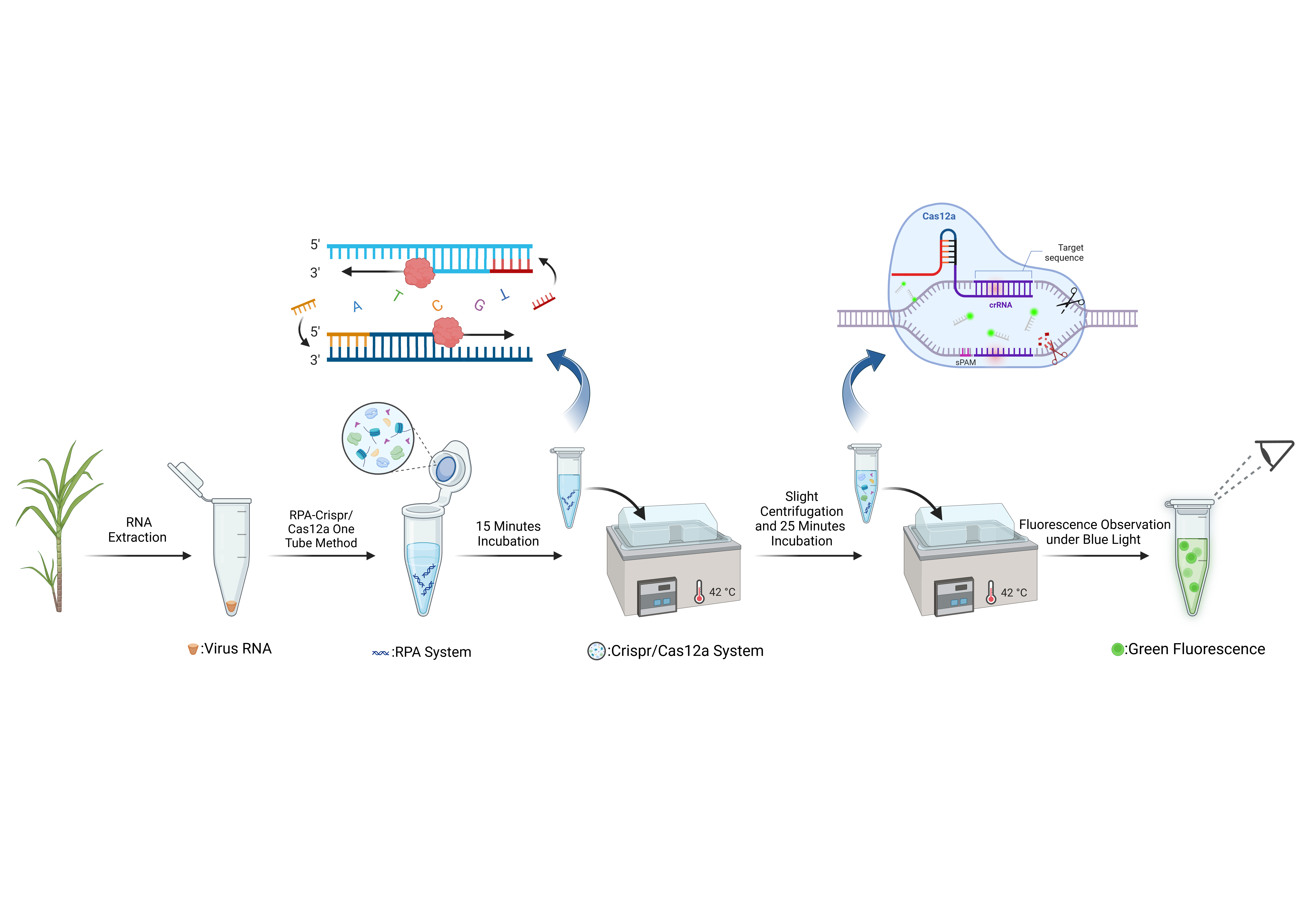 图1. RPA-CRISPR/Cas12a可视化检测甘蔗条纹花叶病毒流程图