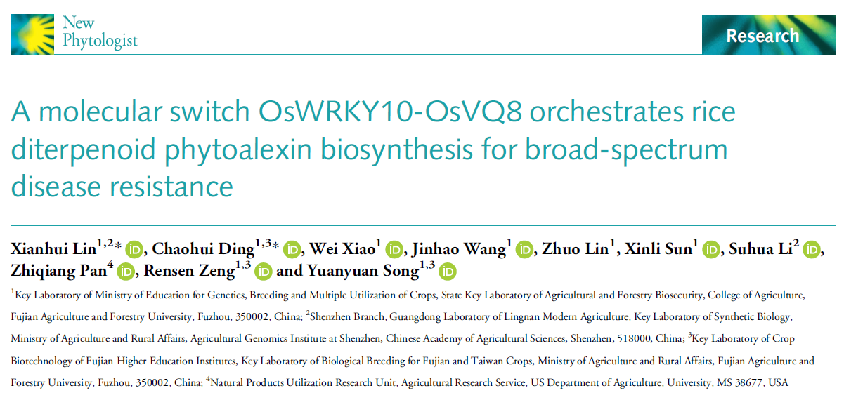 3月17日,New Phytologist在线发表了开云网页版农学院作物遗传育种与综合利用教育部重点实验室曾任森教授作物抗性与化学生态学研究团队题为“A molecular switch OsWRKY10-OsVQ8 orchestrates rice diterpenoid phytoalexin biosynthesis for broad-spectrum disease resistance”(分子开关OsWRKY10-OsVQ8精准调控水稻二萜植保素生物合成实现广谱抗病)的研究论文。该研究阐明OsWRKY10-OsVQ8组成分子开关调控水稻重要抗病防御次生代谢物二萜植保素生物合成,介导水稻广谱抗病性的分子机制。
