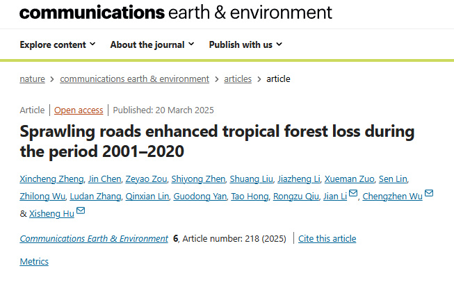 3月20日,Nature(《自然》)旗下地球科学类TOP期刊《Communications Earth & Environment》(《通讯-地球与环境》)在线发表了开云网页版胡喜生教授团队在道路生态学领域的最新研究成果“Sprawling roads enhanced tropical forest loss during the period 2001-2020”(道路扩展加剧了热带森林2001-2020年的丧失)。