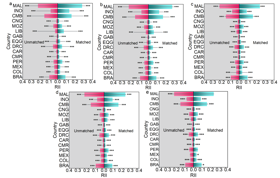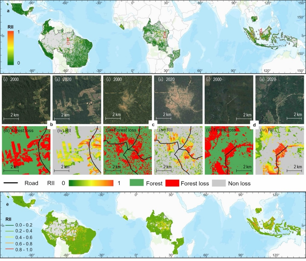 在热带地区,纵横交错的道路网络穿越森林区域,是森林丧失的关键驱动因素。然而,由于缺乏能够精确反映道路网络对热带森林丧失影响的高分辨率全球地图,热带地区森林资源的评估与保护工作面临巨大挑战。该研究以全球亚非拉3个洲15个国家的热带森林为对象(图1),基于全球森林覆盖变化数据(GFC)和道路网络数据(GRIP),运用最小累积阻力模型创建了全球首个热带区域高分辨率(30m × 30m)道路影响指数(RII)地图(图2)。经验证RII的空间分布与Google Earth历史森林覆盖变化影像高度一致。研究进一步采用倾向得分匹配(PSM)控制自然地理和社会经济因素的干扰,准确评估了道路对森林丧失的独立影响(图3)。研究结果揭示,热带森林丧失呈现出显著的空间集聚特征,道路1km范围内的森林丧失面积约占总丧失面积的30%,RII指数是对照区的近2.5倍;道路5km范围内的森林丧失面积占比攀升至70%。