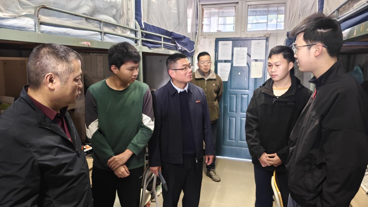 走访过程中,学院领导与学生们进行面对面交流,询问学生们的学习情况、生活习惯、兴趣爱好等,认真倾听学生诉求、解决学生困惑,同时,对宿舍内安全隐患进行排查。在交流中,不仅在学业上为学生提供帮助,也积极关注学生的身心健康、学习压力、生活困扰等,让学生们感受到学院大家庭的温暖。余坤勇强调,要尽早确立发展方向,做到有的放矢、行稳致远;要提升执行力和落实力,锚定目标,孜孜以求,有所成就;要珍惜大学时光,学好专业知识,提升综合素质。
