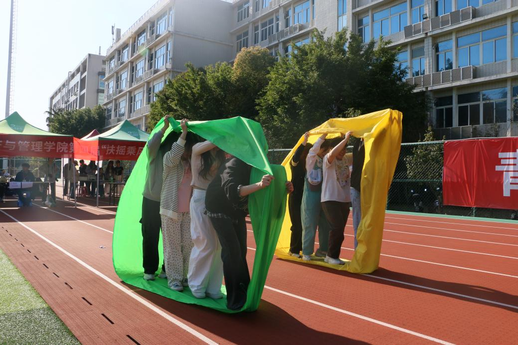 开幕式后,拔河比赛作为首场竞技项目展开激烈角逐。参赛队员紧握绳索、齐声呐喊,红绸在拉锯间牵动全场目光。2024级国贸队凭借默契配合摘得桂冠,彰显团结协作的力量。与此同时,趣味运动会同步进行,四人五足、井字棋接力、不倒森林等创意项目将竞技与趣味结合。参赛者或挽臂疾行,或传递长杆,在欢声笑语中完成挑战,展现青春活力。