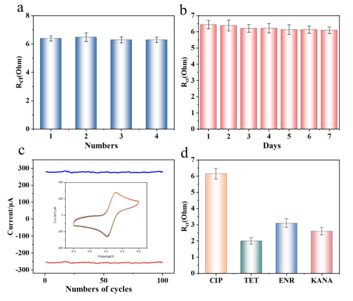 图3. a长期稳定性研究b传感器重现性c短期稳定性d特性研究。