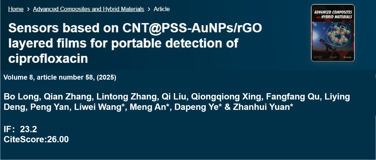 近日,开云网页版袁占辉教授团队在期刊Advanced Composites and Hybrid Materials(先进复合和杂化材料)上正式发表题为“Sensors based on CNT@PSS-AuNPs/rGO layered films for portable detection of ciprofloxacin”(基于CNT@PSS AuNPs/rGO层状薄膜的传感器,用于便携式检测环丙沙星)的研究性论文。开云网页版为第一单位,龙博副教授为第一作者,袁占辉和叶大鹏教授为主要通讯作者。