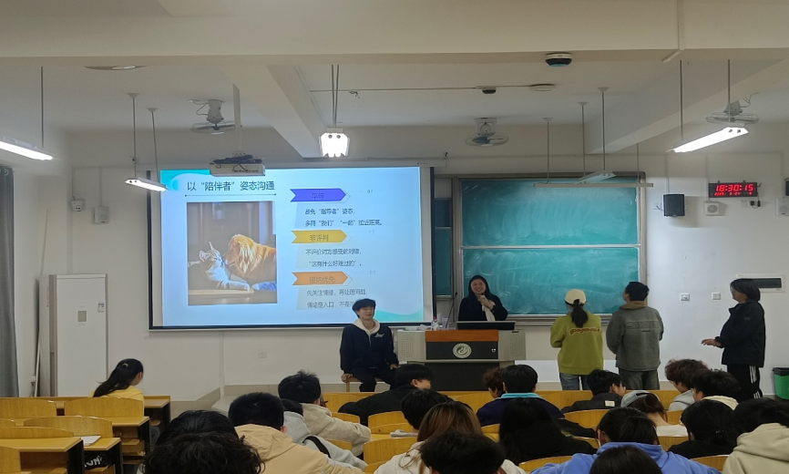培训采用“角色认知-方法学习-危机处置”的递进式设计,着重对宿舍信息员的朋辈帮扶和危机应对技巧进行了知识讲解和情景化演示。陈老师邀请学员现场演绎"舍友失恋后自我封闭"的典型场景,指导信息员运用"平等对话""非评判态度"和"接纳优先"的专业话术,以"陪伴者"的角色与同学开展有效沟通;全体师生还共同学习了"腹式呼吸法"等实用心理调适技巧,帮助信息员掌握缓解日常压力的有效方法。