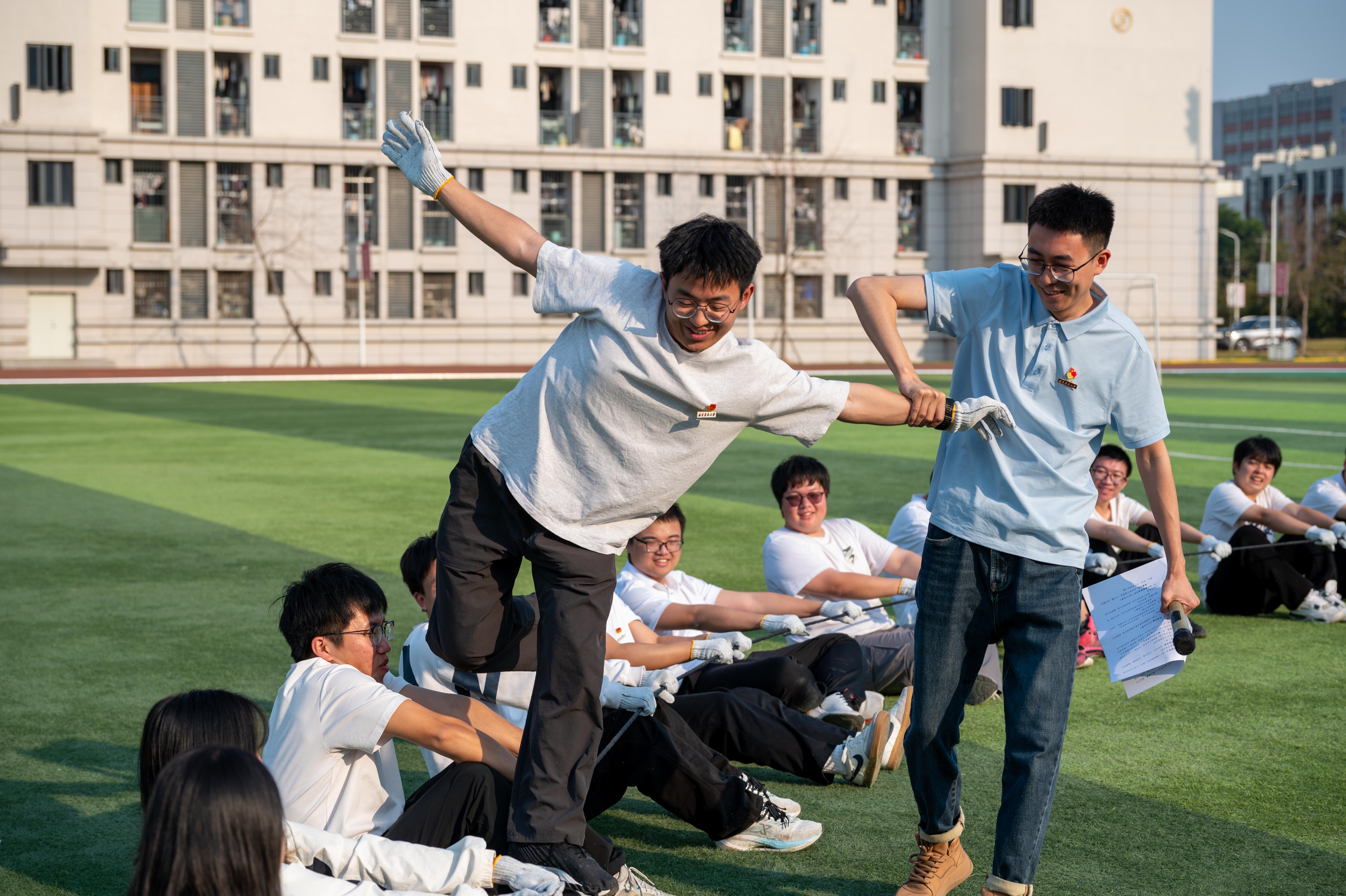 在“动力圈绳”活动中,全体成员围坐在操场草坪,手握圈绳,蓄势待发。在教练员带领下,全体成员共同完成了“平起平坐”“绳子运人”“极限摇绳——1000次”的挑战任务,充分诠释了“同心山成玉,协力土变金”的精神,展现了青马班、研习社成员的青春活力。
