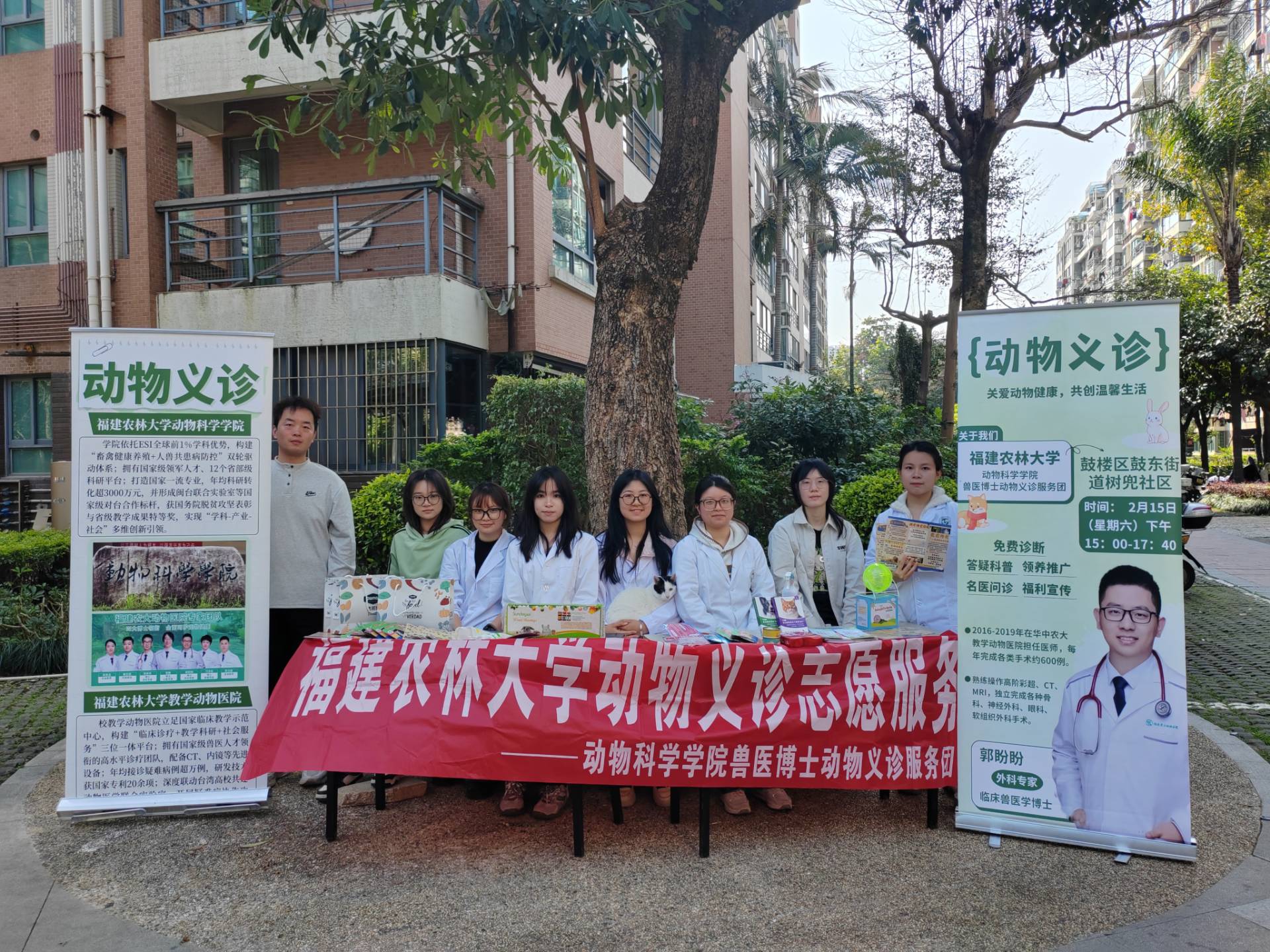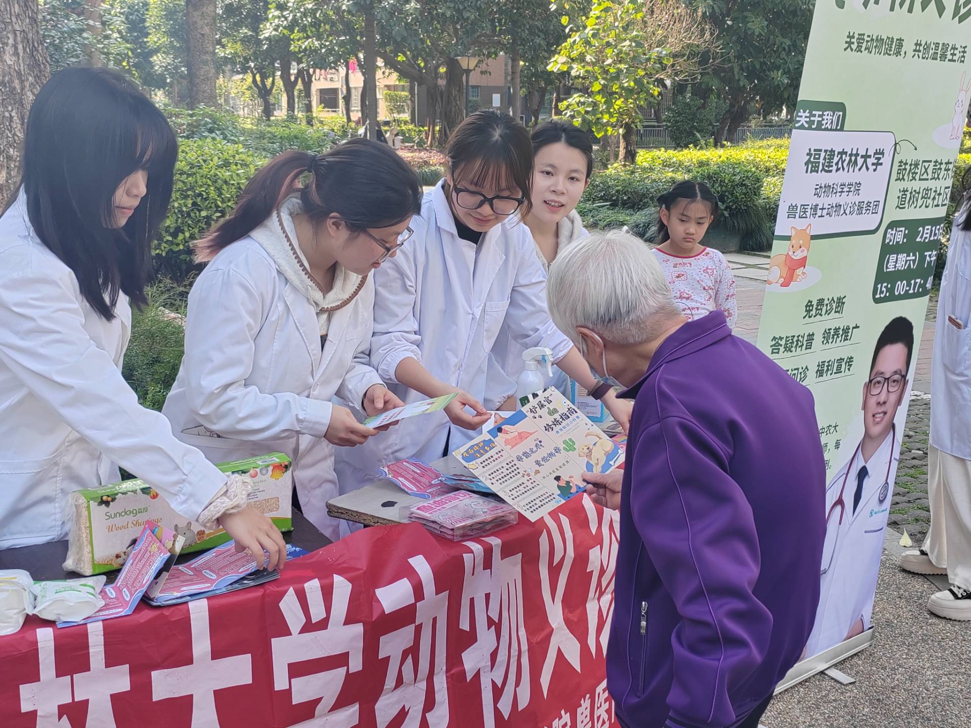 近期,动物科学学院联合校教学动物医院,组建兽医博士志愿服务团,深入仓山区水都社区开展动物志愿诊疗活动。活动以“科普宣教+精准诊疗”双轨模式,为社区宠物提供基础体检、寄生虫筛查等十多项基础诊疗服务,发放《科学养宠手册》150余份,惠及社区居民200余人次。