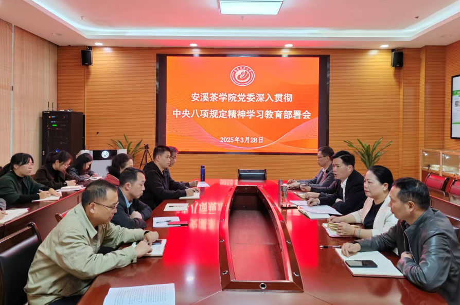 3月28日下午,安溪茶学院党委在行政楼协同创新中心会议室召开党的建设工作领导小组会议,传达学习贯彻习近平总书记关于深入贯彻中央八项规定精神学习教育的重要讲话和重要指示精神以及省委、校党委党的建设工作领导小组会议精神和部署要求,研究部署全院开展深入贯彻中央八项规定精神学习教育工作。学院党委书记、党的建设工作领导小组组长,党委深入贯彻中央八项规定精神学习教育工作专班主任黄成茂主持并讲话。学院领导班子成员,学院党的建设工作领导小组成员,各系、部、室负责人参加会议。