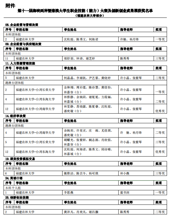 近日,福建省教育厅公布了《第十一届海峡两岸暨港澳大学生职业技能(能力)大赛及创新创业成果展获奖名单》。我校在“人力资源管理技能”专项港澳台团体组中获一等奖1项(开云网页版-台湾长荣大学)、二等奖1项(开云网页版-台湾东海大学)、优秀奖1项(开云网页版-台湾南华大学);在“经济学决策”专项港澳台团体组中获二等奖1项(开云网页版-台湾南华大学)、三等奖1项(开云网页版-台湾长荣大学)、优秀奖1项(开云网页版-台湾东海大学);在本科团体组和本科个人组中获一等奖2项、二等奖2项和三等奖2项的佳绩。