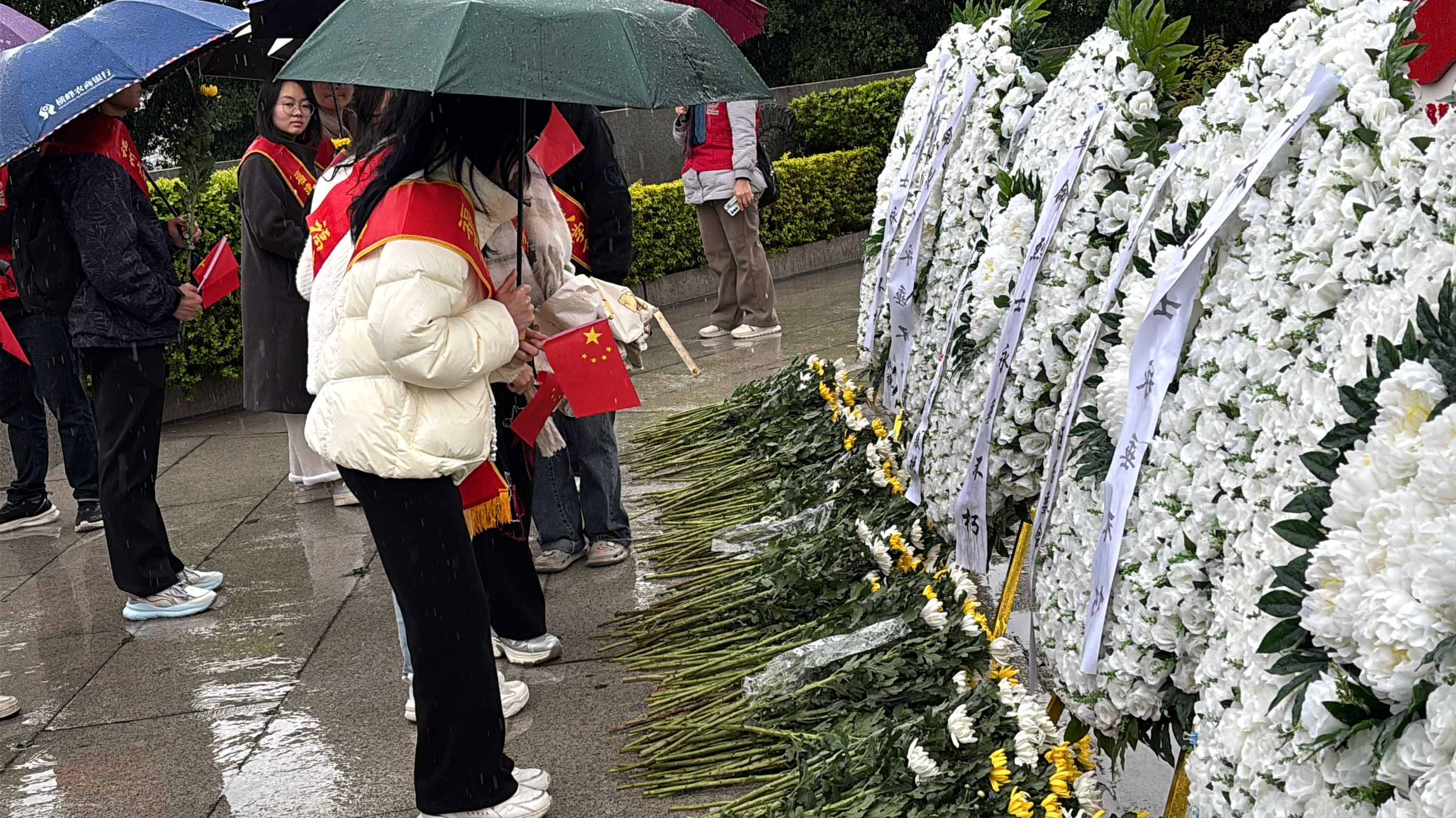 活动现场,雨滴打在石碑上激起细碎涟漪,全场垂首默哀,向革命先烈致以崇高的敬意。随后,大家踏着湿润的石阶,依次上前把白菊轻轻放在烈士墓碑前,以此表达对英烈的深切缅怀与敬仰。学生代表还敬献了花篮并整理挽联,瞻仰了纪念碑上的浮雕,参观了烈士事迹陈列馆。在细雨的洗礼下,整个仪式更显庄重肃穆,进一步突出了对革命先烈的崇敬与缅怀之情,使青年学子深刻体会到红色政权的来之不易。
