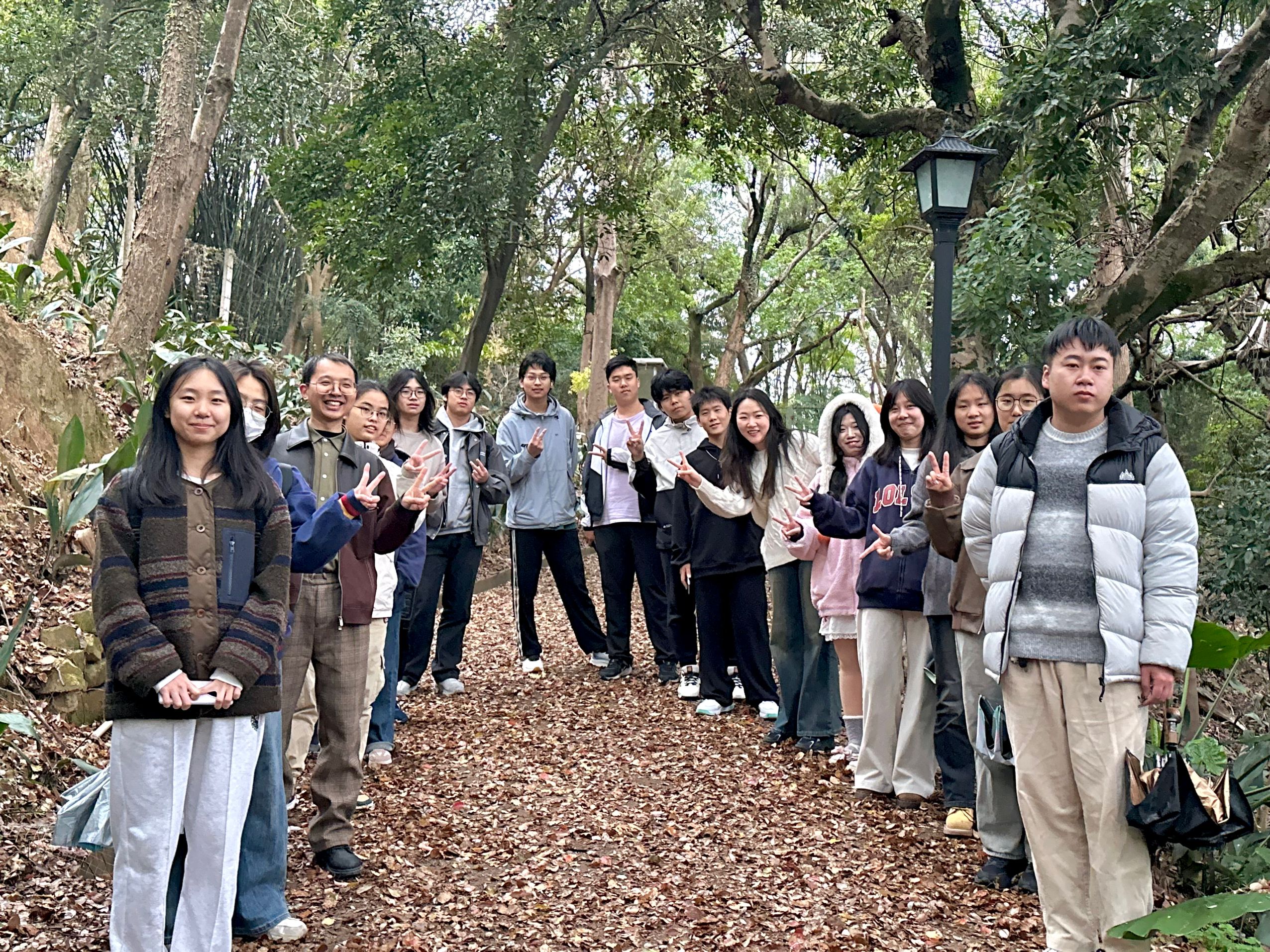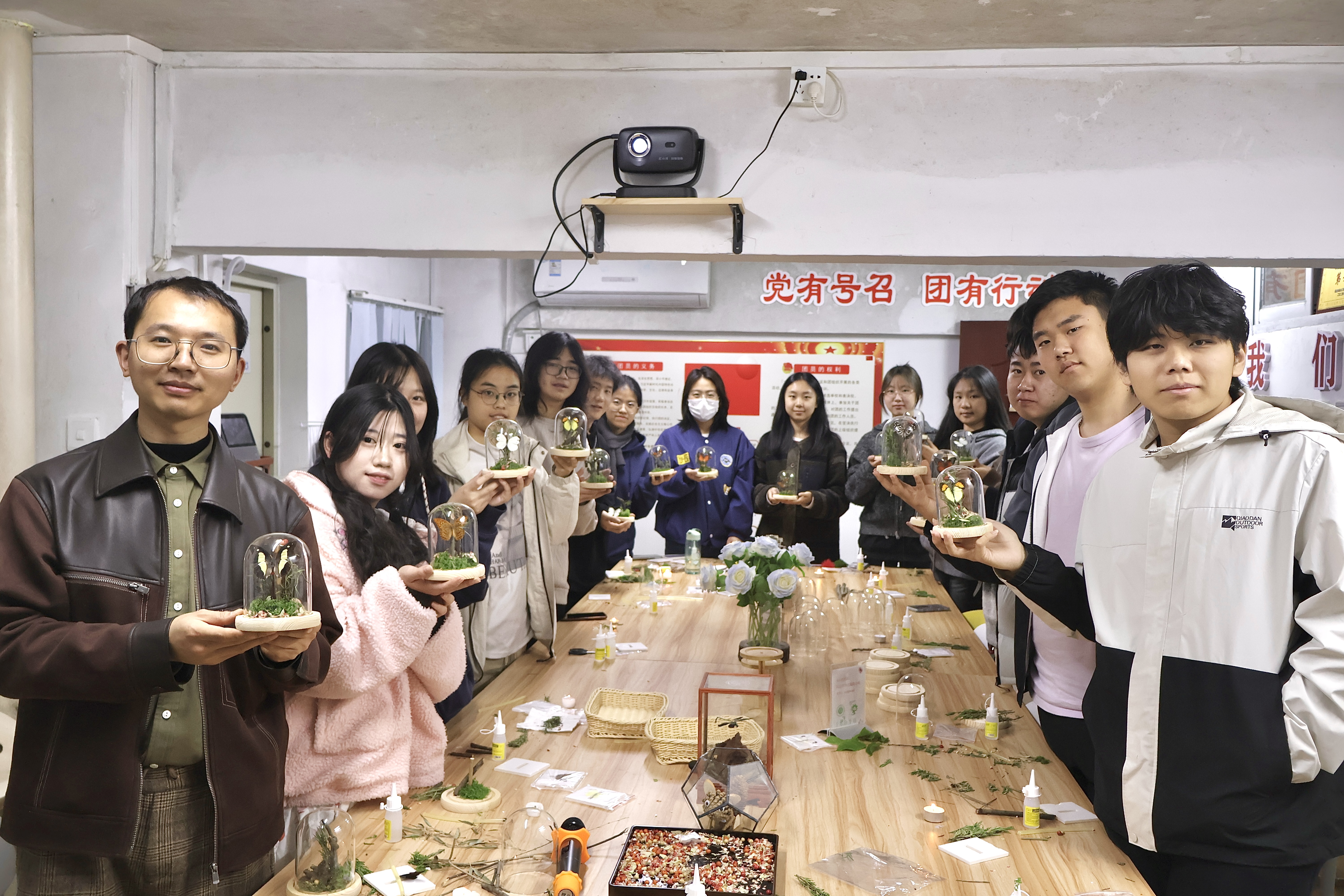 活动以“森林探秘”与“微观造物”两个主题模块展开实践。在森林兰苑,师生们沿步道深入林间,辅导员向同学们详细介绍了文心兰、蝴蝶兰、金线莲、香樟树等各类植物的形态特征、生长习性以及它们在生态环境中的重要作用。同学们一边聆听讲解,一边仔细观察,漫步至山间凉亭时,同学们围坐在一起,逐一进行自我介绍,并分享参加此次活动的心得与感受。漫步结束后,师生们返回“一站式”学生社区青果助力站进行昆虫微景观制作,同学们在老师指导下用林间采集的树枝、叶片及提前准备的蝴蝶标本等为材料,充分发挥自己的想象力和创造力,制作出一个个独具特色的昆虫微景观,通过亲手制作微景观,将大自然的美丽与灵动浓缩在了小小的玻璃瓶中,活动进一步加深了大家对自然的热爱与敬畏之情。