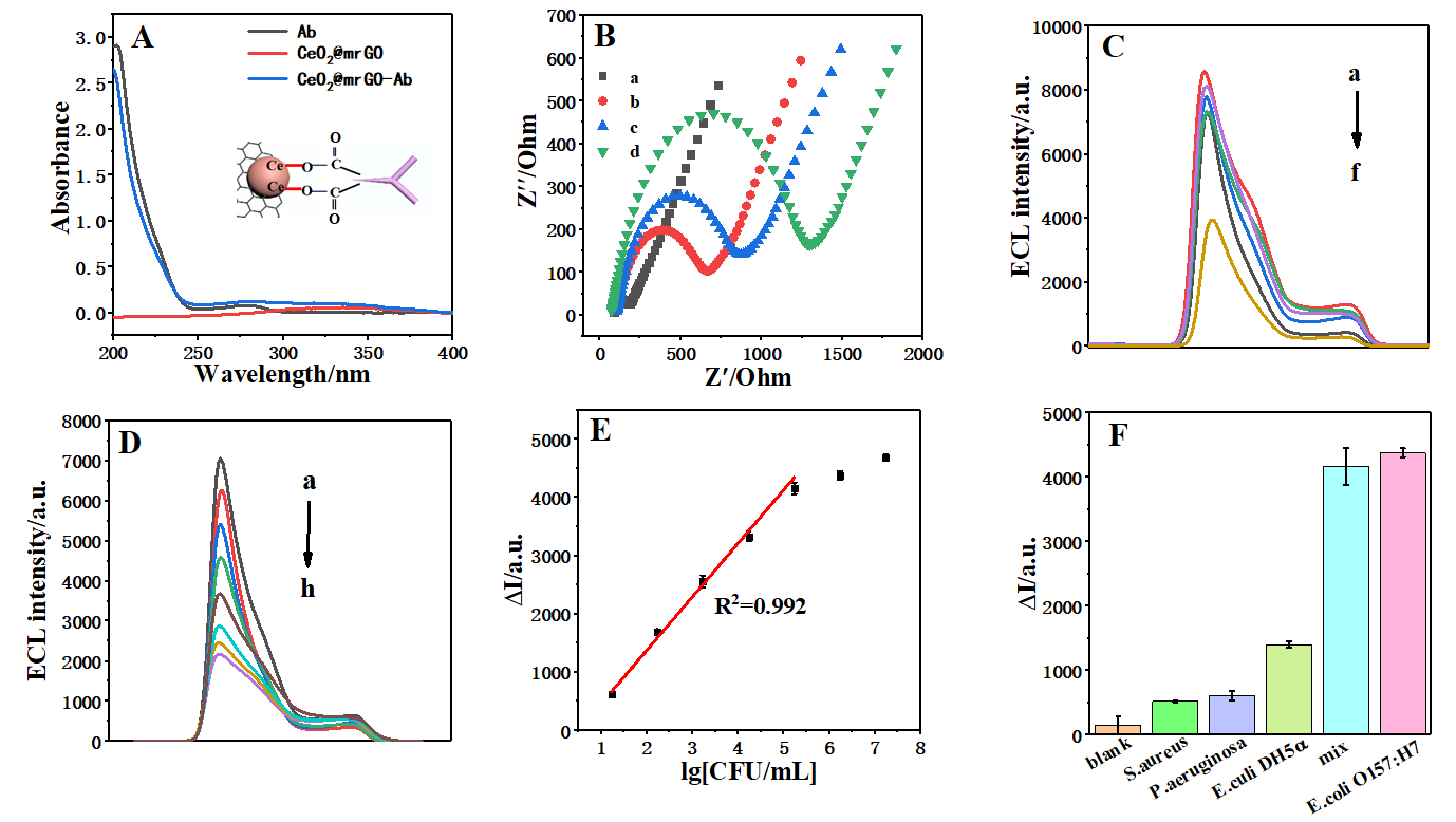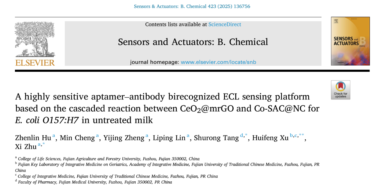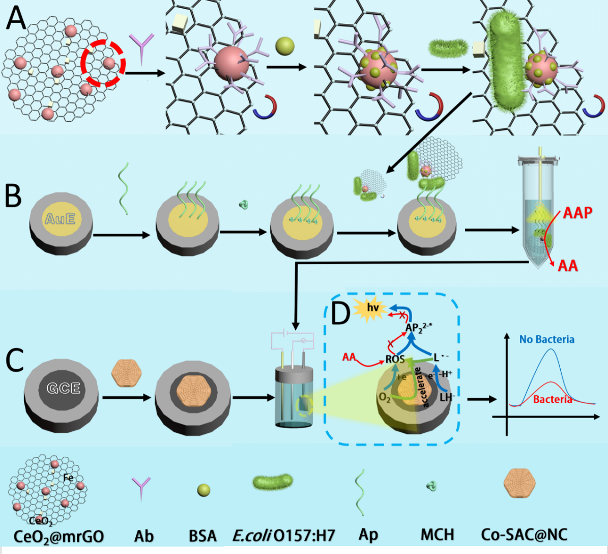 近日,开云网页版生命科学学院生物化学团队朱希课题组在Sensors and Actuators: B-Chemical(传感器和执行器 B-化学)发表题为“A highly sensitive aptamer–antibody birecognized ECL sensing platform based on the cascaded reaction between CeO2@mrGO and Co-SAC@NC for E. coli O157:H7 in untreated milk”(基于CeO2@mrGO和Co-SAC@NC级联反应的高灵敏度适配体-抗体双识别ECL传感平台用于检测未经处理的牛奶中的大肠杆菌O157:H7)的研究论文,为食品中致病菌E. coli O157:H7的检测提供了一种更加快速灵敏的新方法。
