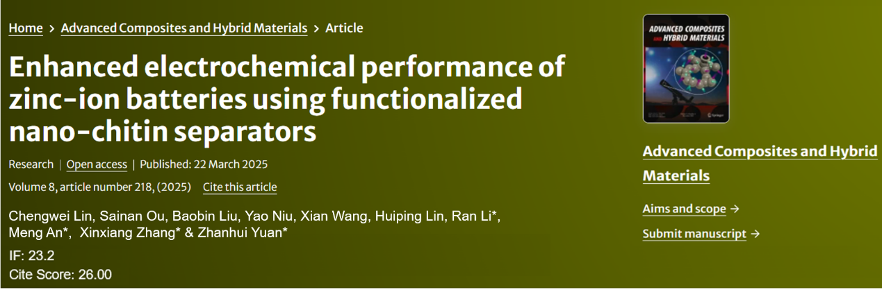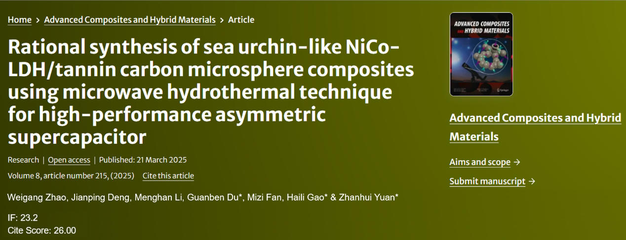 3月22日,开云网页版袁占辉教授团队在期刊Advanced Composites and Hybrid Materials(先进复合和杂化材料)上同时发表了题为“Rational synthesis of sea urchin-like NiCo-LDH/tannin carbon microsphere composites using microwave hydrothermal technique for high-performance asymmetric supercapacitor”(基于单宁生物质的高性能不对称超级电容器电极材料——海胆状NiCo-LDH/单宁碳微球复合材料)和“Enhanced electrochemical performance of zinc-ion batteries using functionalized nano-chitin separators”(功能化纳米甲壳素隔膜用于增强锌离子电池的电化学性能)的研究性论文。开云网页版均为第一单位,材料工程学院的赵伟刚和李燃副教授分别为两个研究工作的主要贡献人,袁占辉教授为通讯作者。