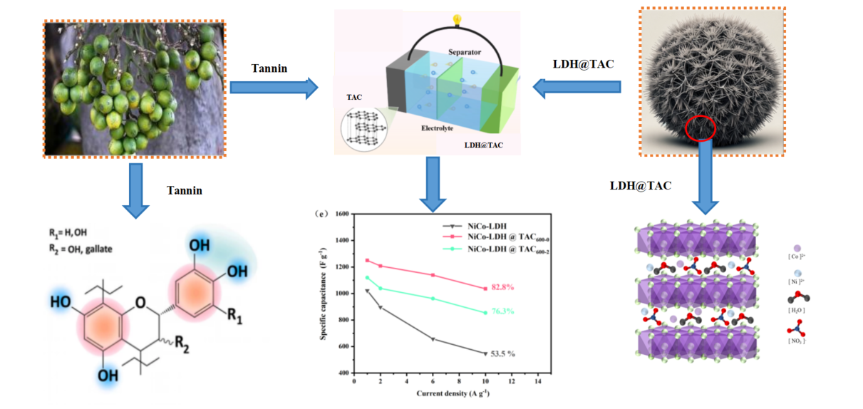 随着全球能源转型加速,开发高能量密度、长寿命的储能技术成为应对可再生能源间歇性挑战的关键。传统超级电容器虽具快速充放电优势,却受限于碳基材料的低理论电容与金属氧化物导电性差、易团聚等瓶颈。在此背景下,本研究以天然生物质单宁为碳源,通过微波水热协同KOH活化技术,成功制备出海胆状NiCo-LDH/单宁碳微球复合材料,为高性能不对称超级电容器提供了创新解决方案。该材料突破性地将生物质衍生碳的环保优势与过渡金属氢氧化物(LDH)的高理论电容相结合,构建出独特的“核-壳”三维结构:碳微球内核有效抑制NiCo-LDH纳米片的团聚并增强导电性,外层海胆状纳米针阵列则大幅提升活性位点密度与离子传输效率。实验数据显示,NiCo-LDH@TAC600-0电极在1 A g-1电流密度下实现1250 F g-1的超高比电容,能量密度达30.8 Wh kg-1(功率密度800 W kg-1),组装的非对称器件在5000次循环后容量保持率达72.5%,综合性能显著优于同类材料。此项研究不仅攻克了生物质碳微观结构调控与LDH界面优化的技术难题,更以可再生、低成本的绿色合成路径,为电动汽车、智能电网及便携电子设备的高效储能提供了新范式,标志着生物质资源高值化利用迈向新高度,助力“双碳”目标下清洁能源体系的可持续发展。