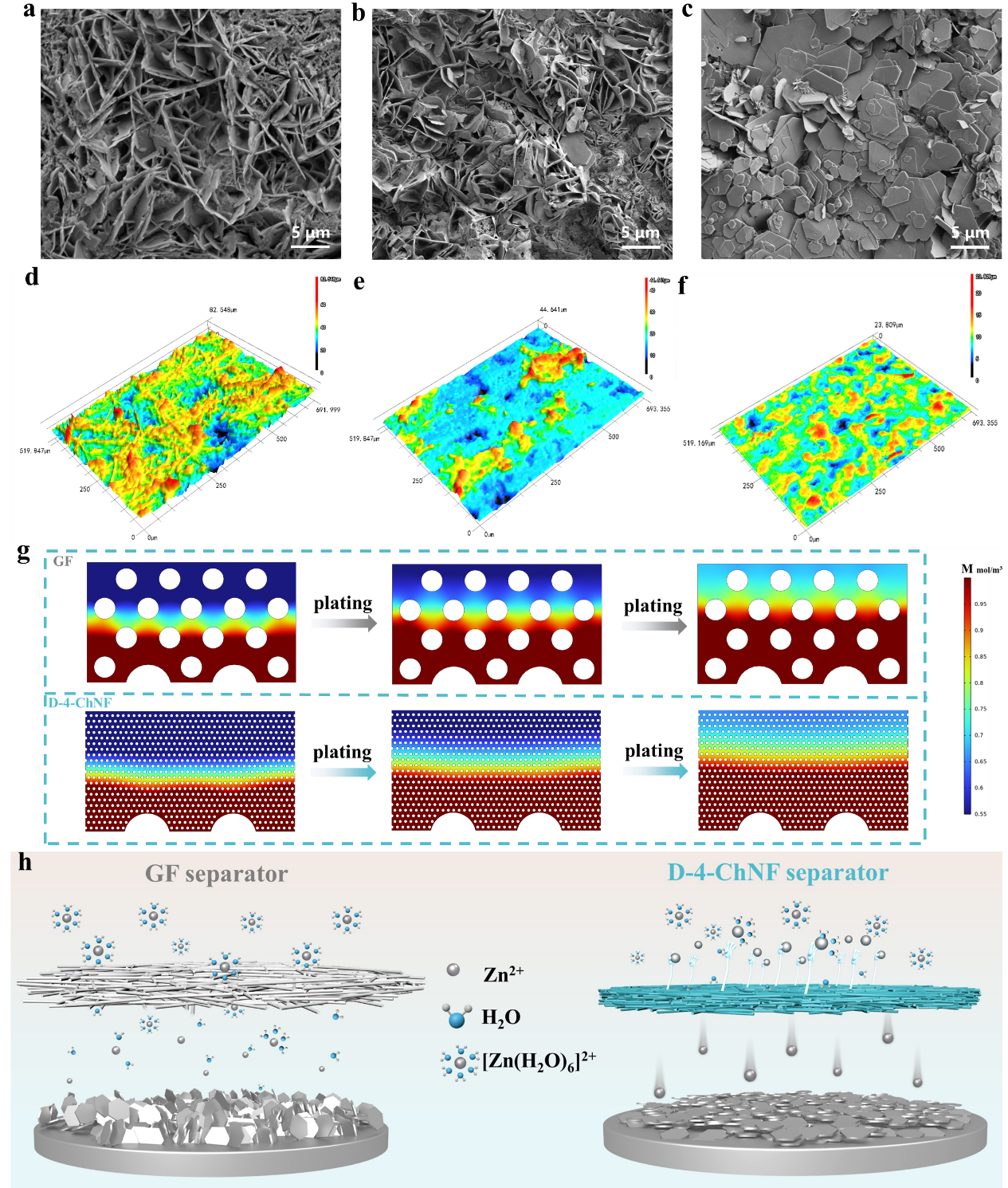 图6. 具有各种隔膜的Zn对称电池中镀锌和剥离的可逆性。使用(a)和(d)GF 、(b)和(e)D-0-ChNF、(c)和(f)D-4-ChNF隔膜在5 mA cm-2的电流密度和5 mAh cm-2的容量下循环60次后Zn阳极的SEM和LCSM图像;(g)GF和D-4-ChNF对应的浓度场模拟;(h)GF和D-4-ChNF隔膜上Zn沉积行为的示意图。
