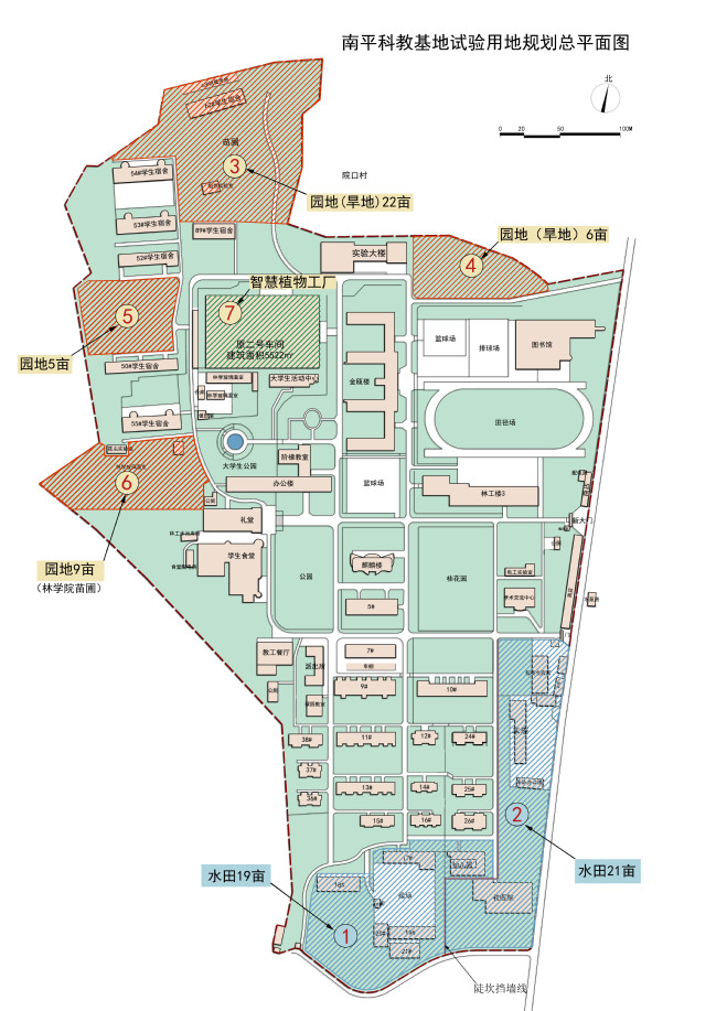 我校南平(西芹)科教基地地处南平市延平区西芹镇,占地面积约308亩。经多次实地调研、广泛听取意见建议,校党委决定对南平(西芹)科教基地进行重新规划,在加强原有林场建设的基础上,调整整理6块土地作为农业试验地,其中2块为水田地(共计40亩),4块为园地(共计42亩),规划总面积82亩;此外,将建筑面积5522平方米(8.3亩)的原“二号车间”改造为智慧植物工厂;从而创造出体现福建特色的农林混合生态系统的典型场景。